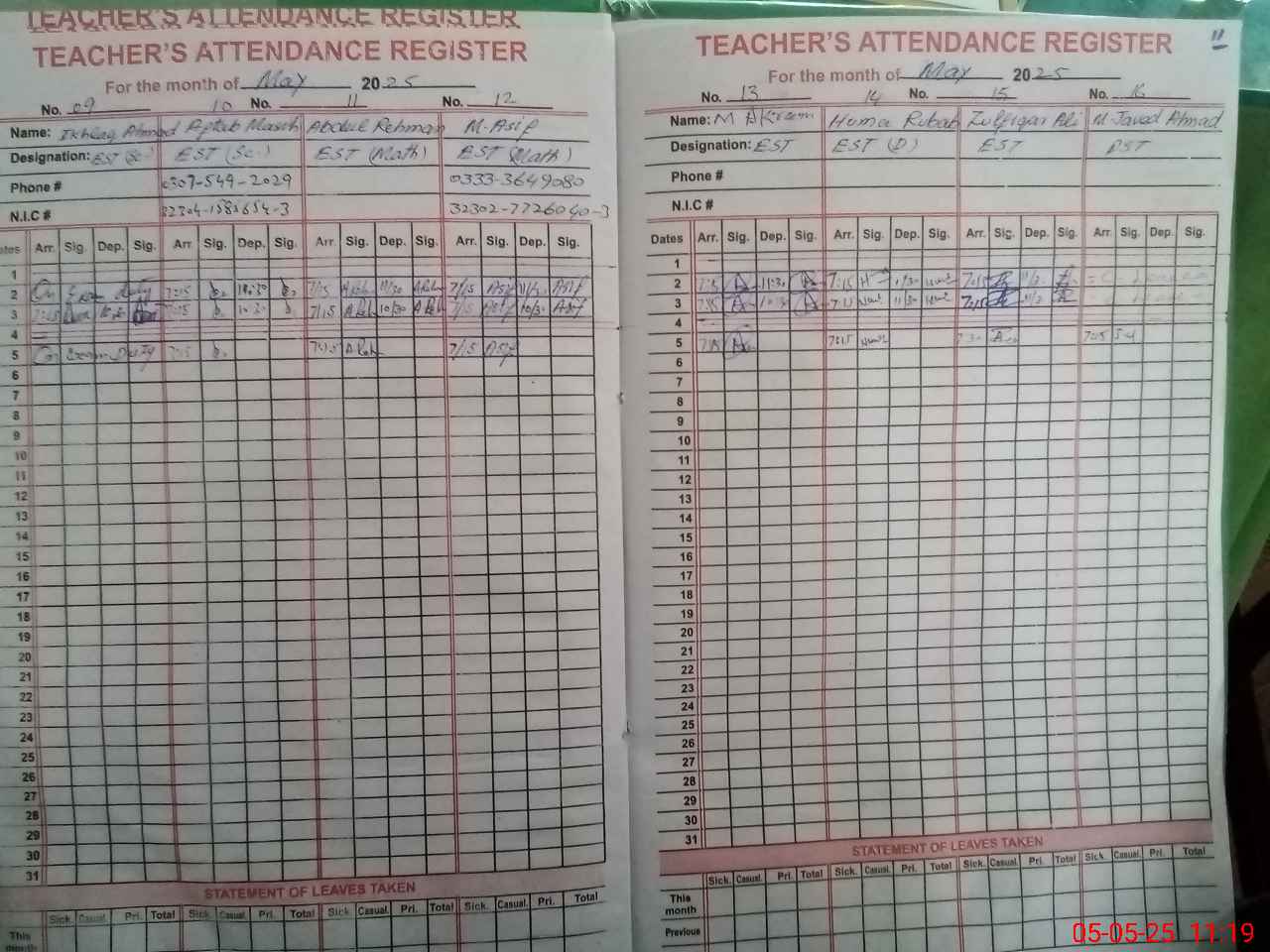 | CNIC | Full Name | Designation | R/C | Absence during last cal. month |