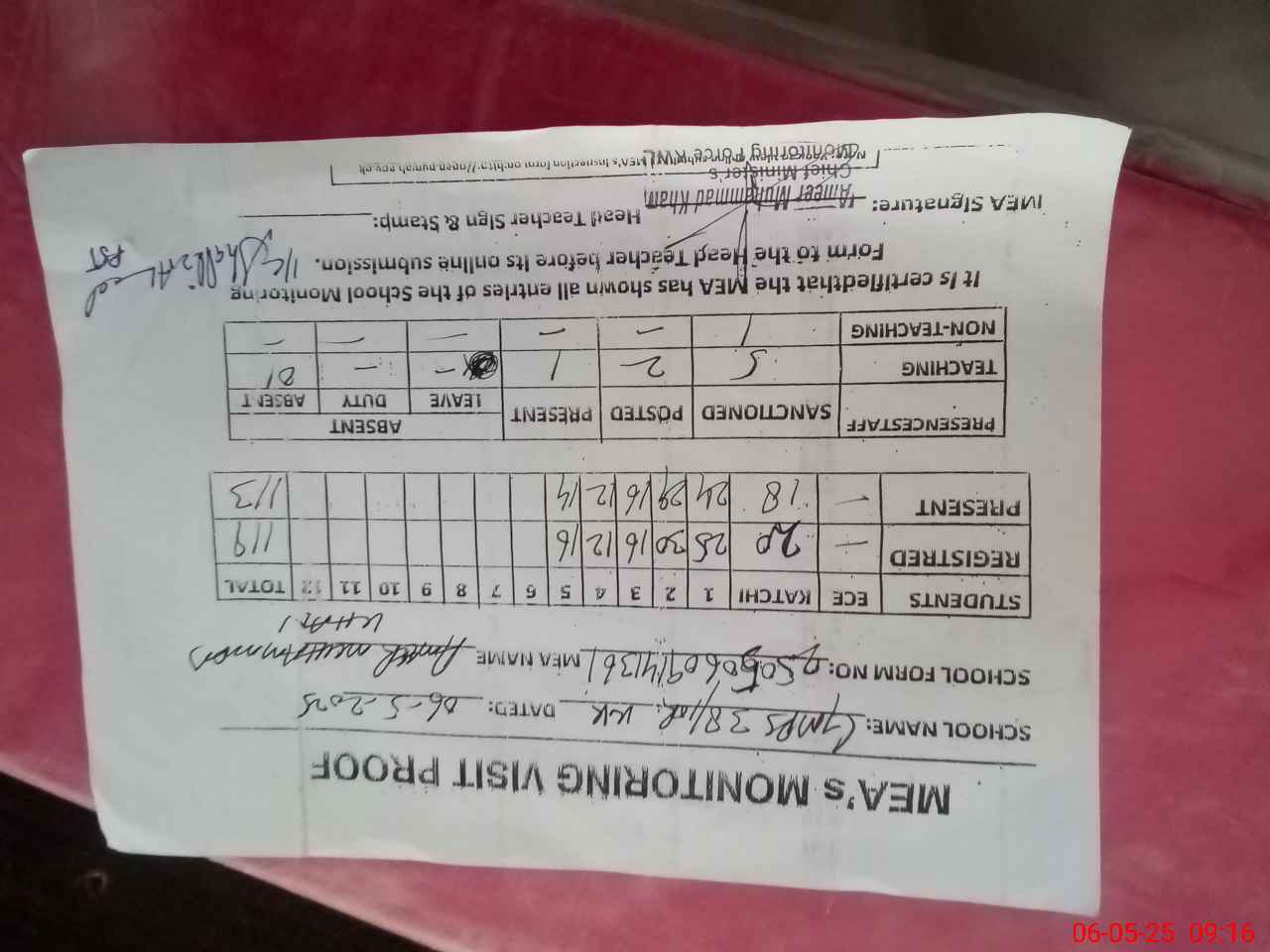 | Attendance Register | Head Teacher | MEA with School | Visit Proof |