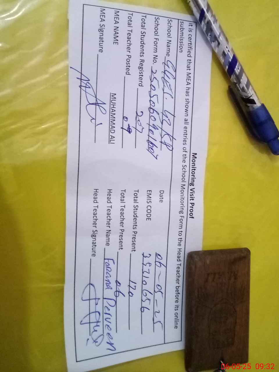 | Attendance Register | Head Teacher | MEA with School | Visit Proof |