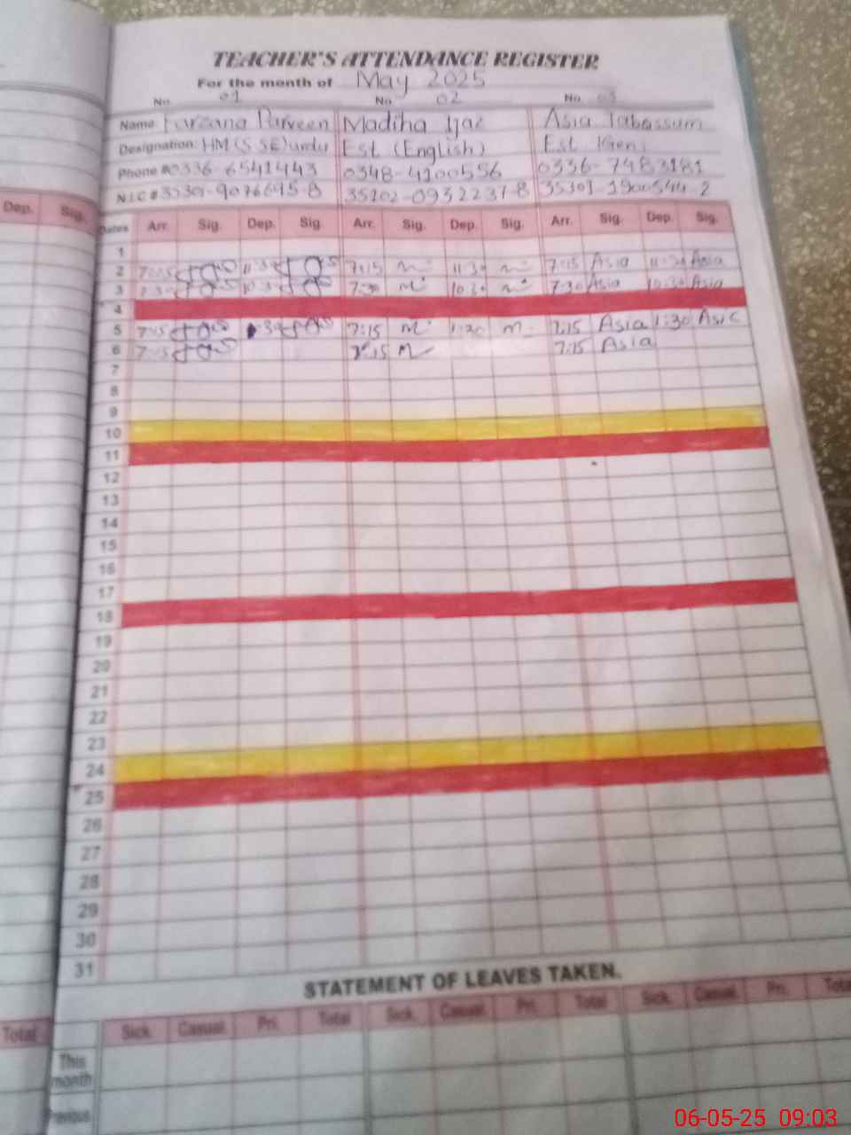 | CNIC | Full Name | Designation | R/C | Absence During Last Calender Month |