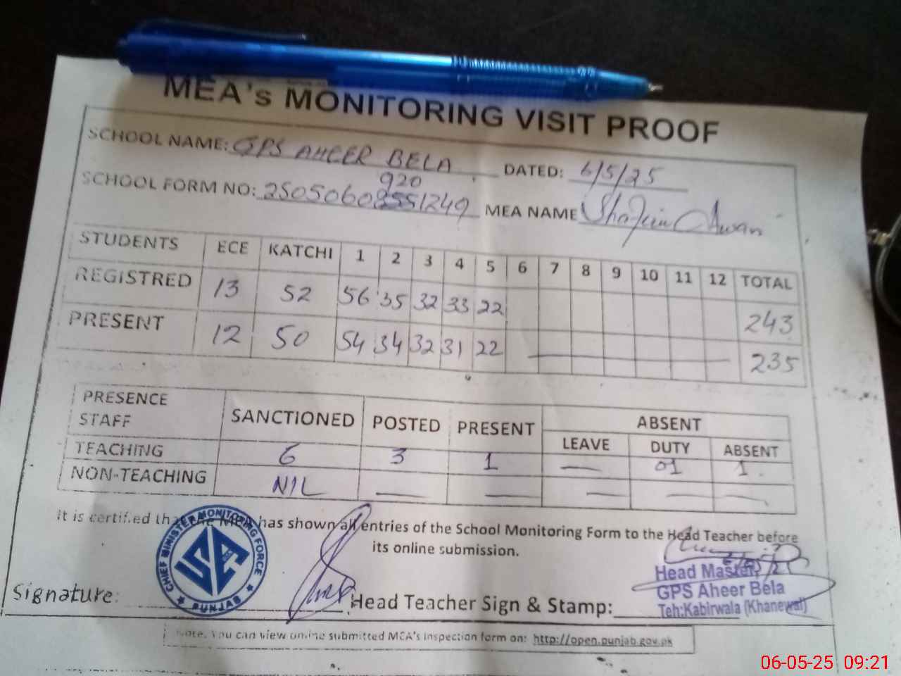 | Attendance Register | Head Teacher | MEA with School | Visit Proof |