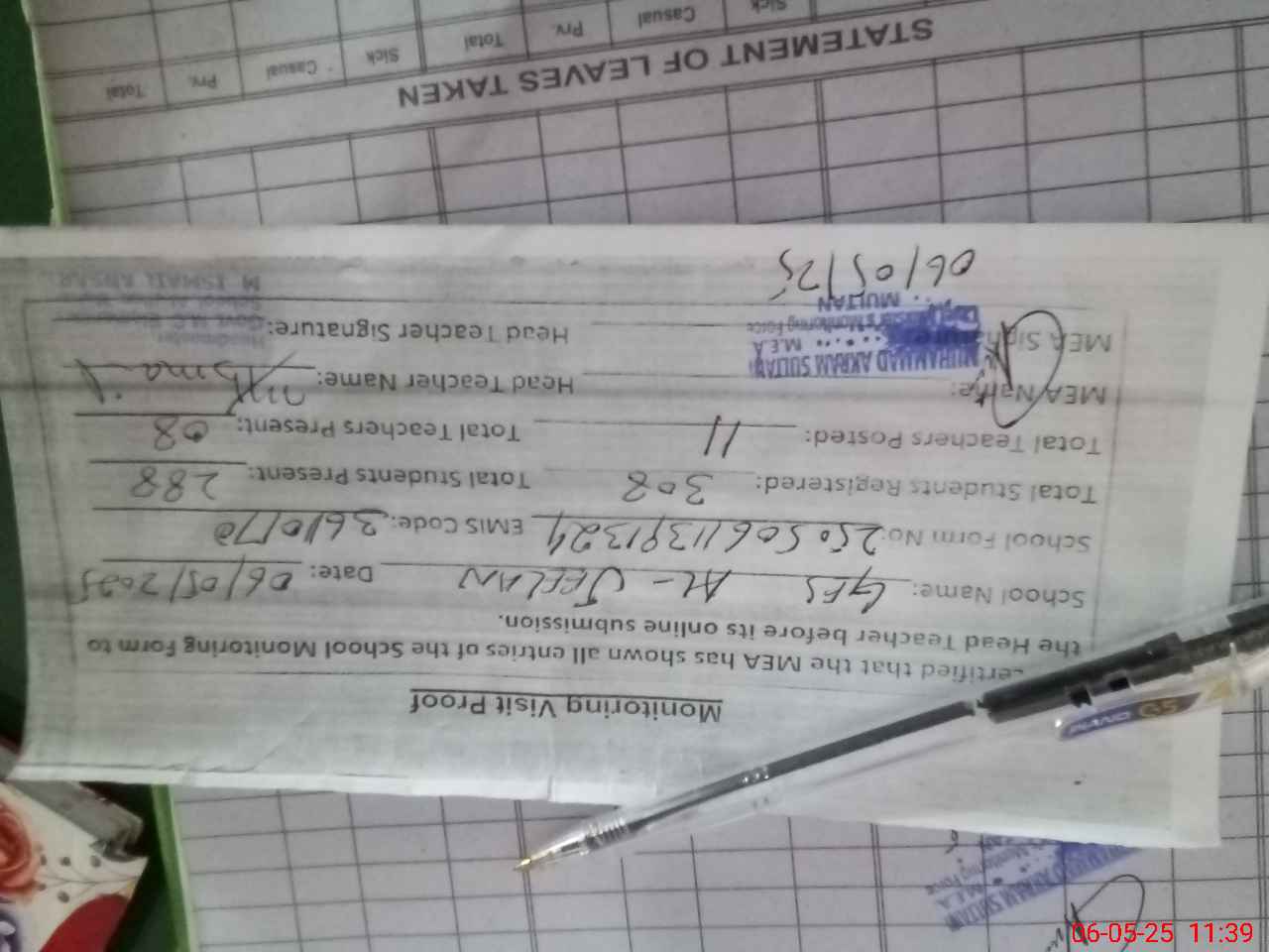 | Attendance Register | Head Teacher | MEA with School | Visit Proof |
