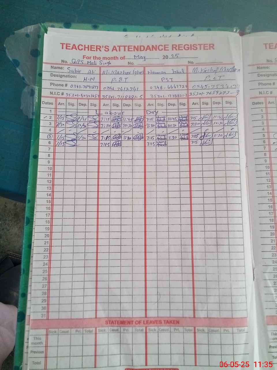 | CNIC | Full Name | Designation | R/C | Absence During Last Calender Month |