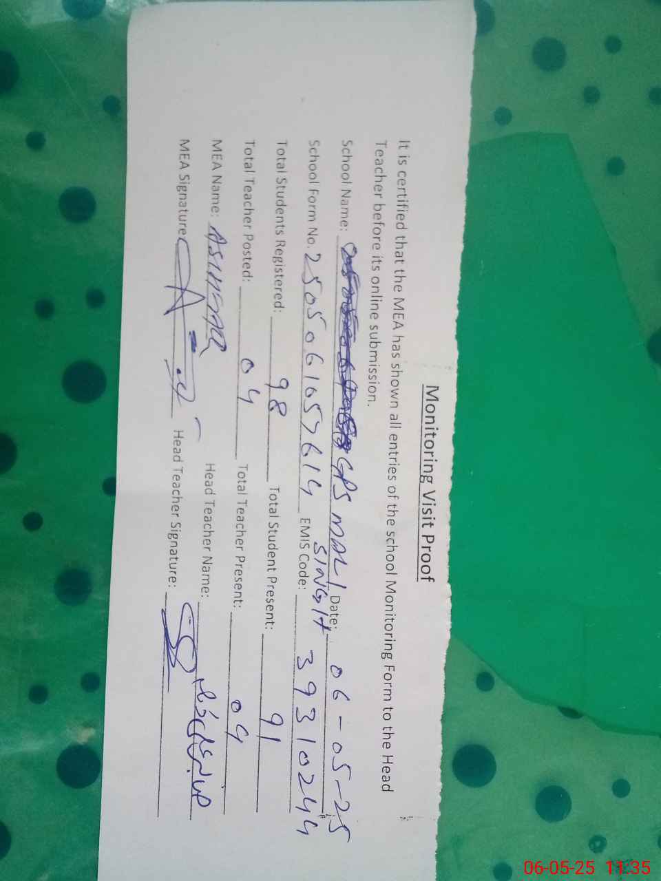 | Attendance Register | Head Teacher | MEA with School | Visit Proof |