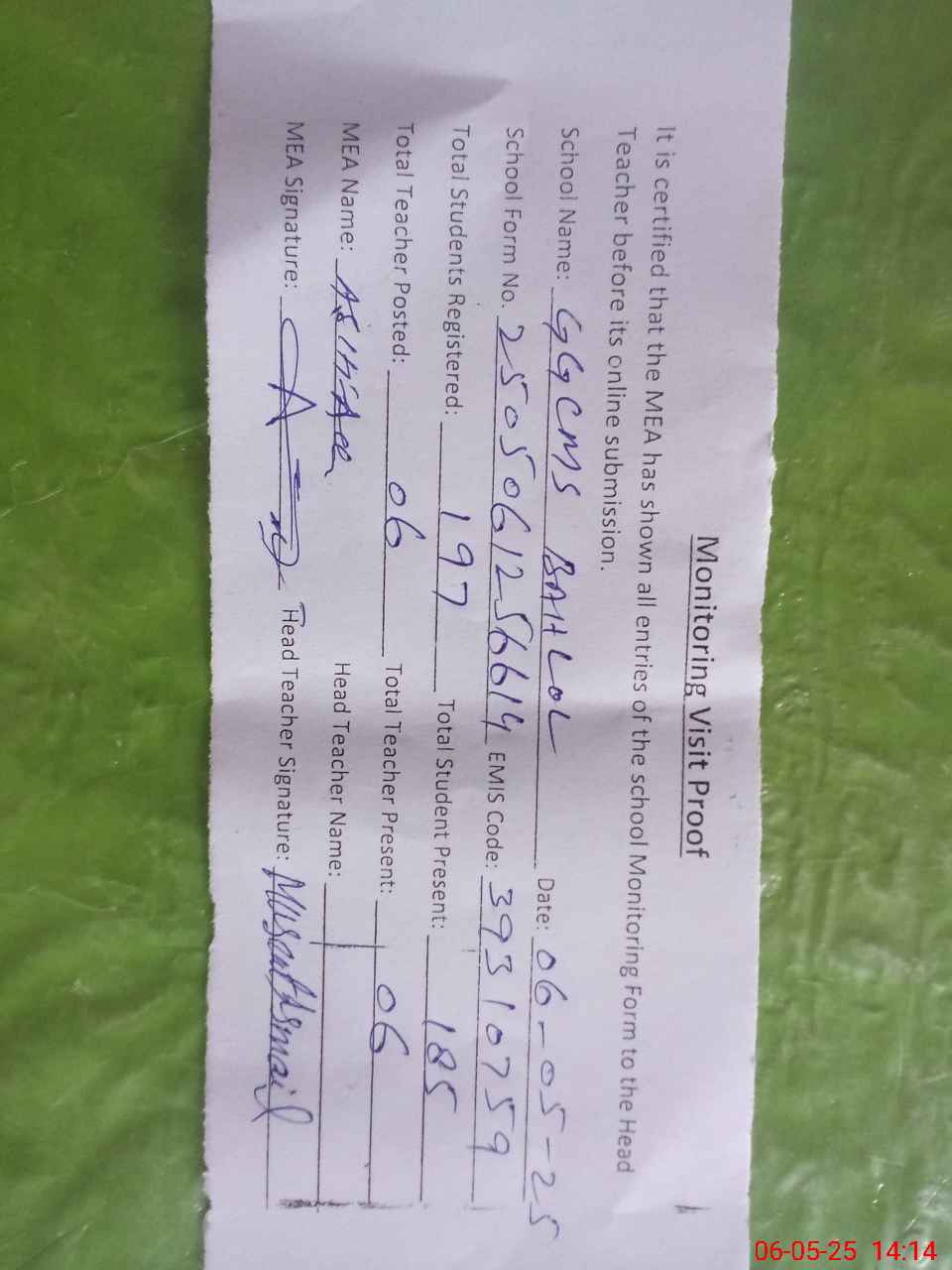 | Attendance Register | Head Teacher | MEA with School | Visit Proof |