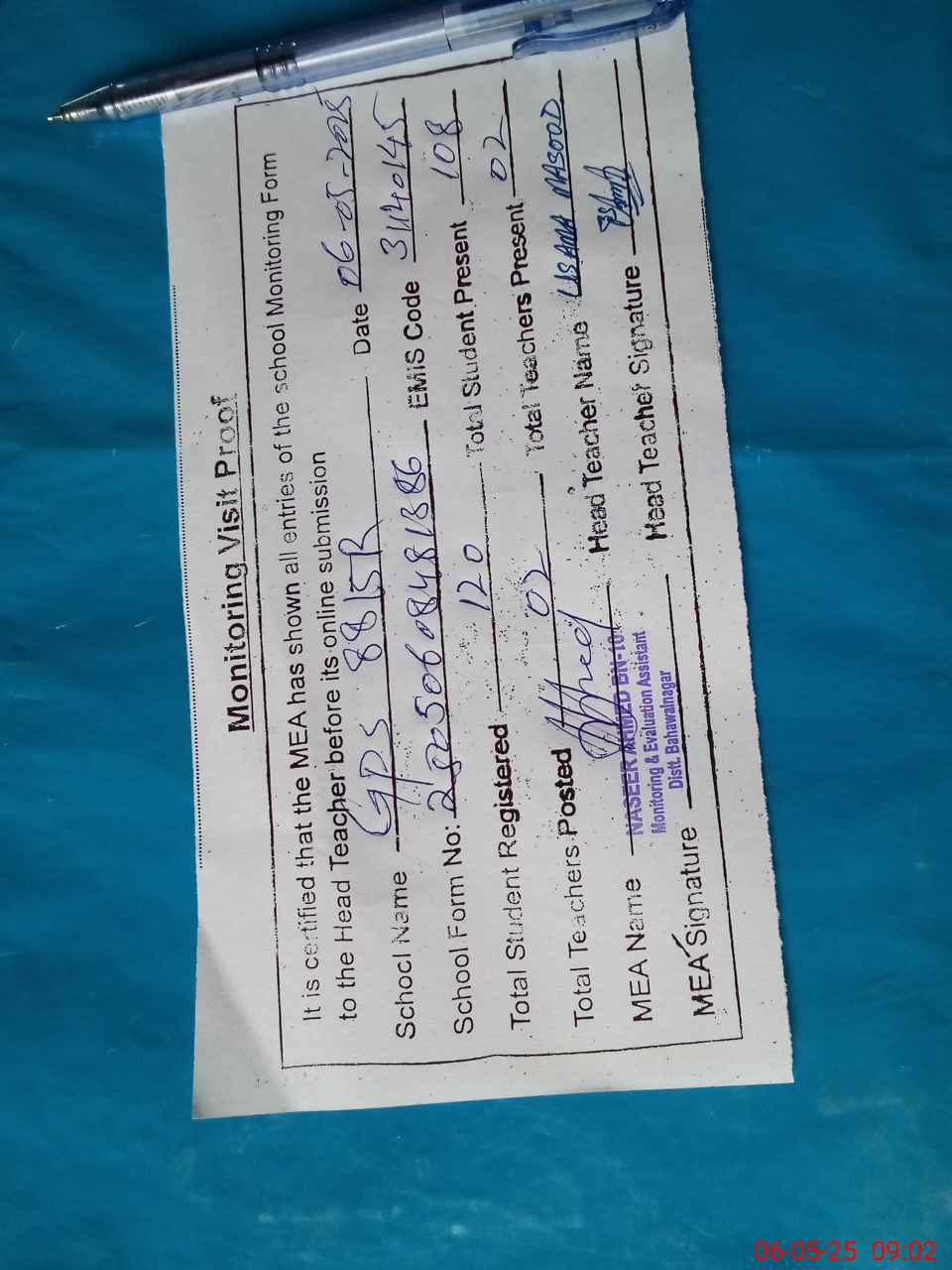 | Attendance Register | Head Teacher | MEA with School | Visit Proof |