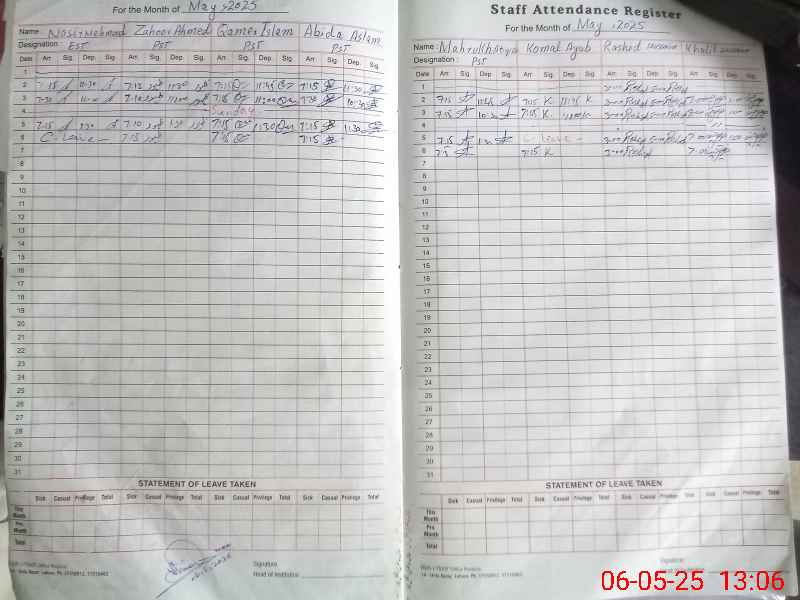 | CNIC | Full Name | Designation | R/C | Absence During Last Calender Month |