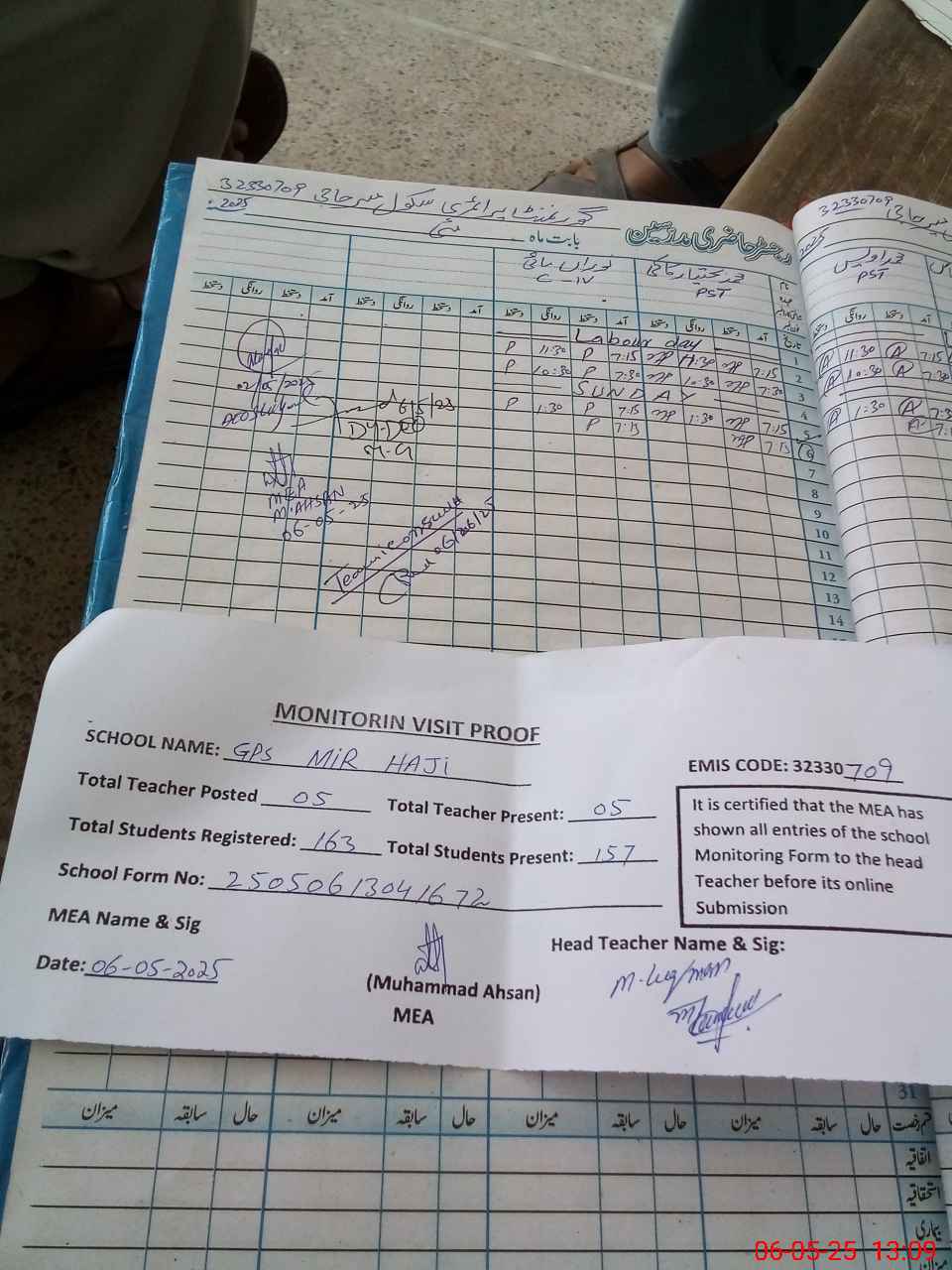 | Attendance Register | Head Teacher | MEA with School | Visit Proof |