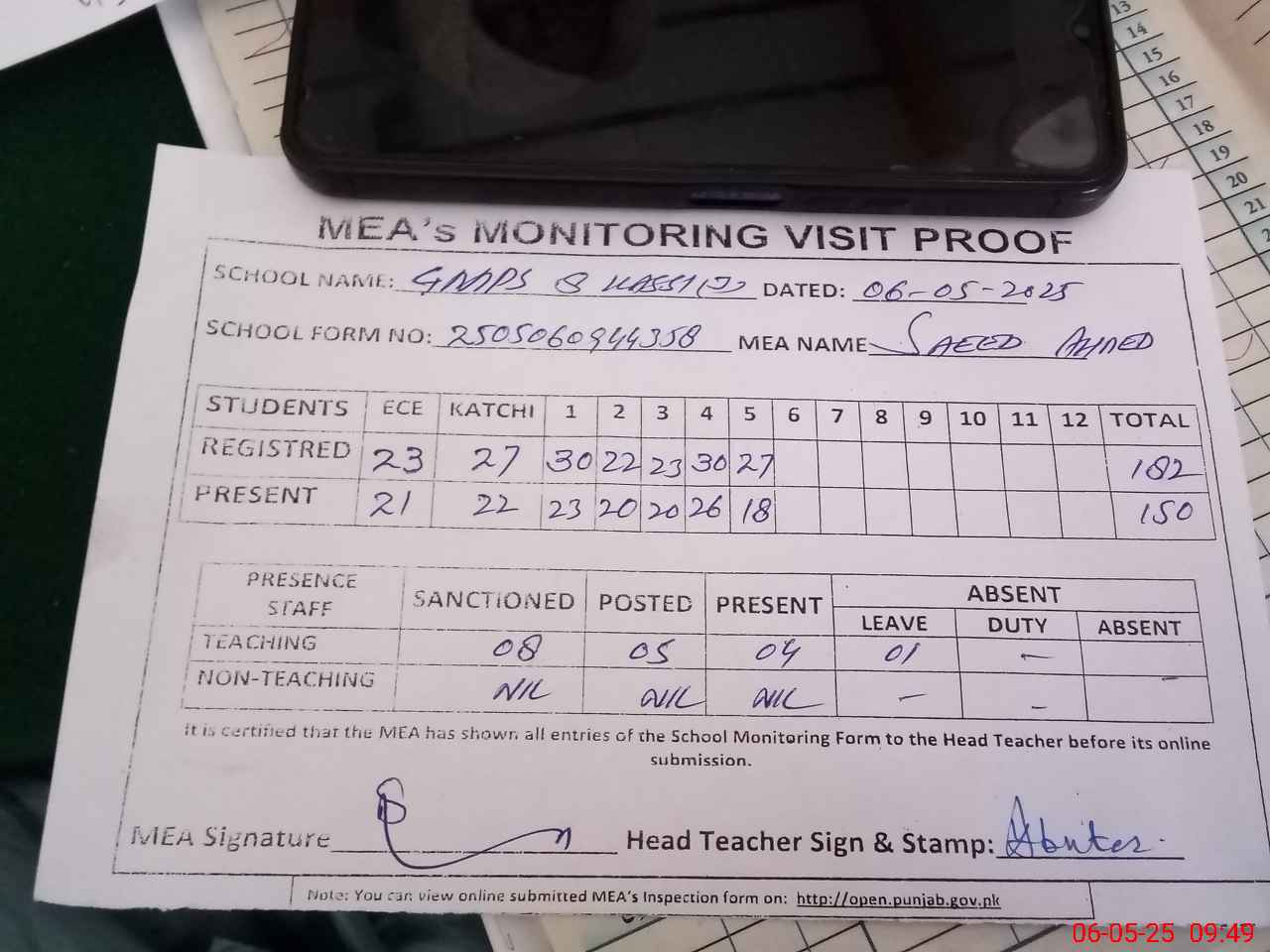 | Attendance Register | Head Teacher | MEA with School | Visit Proof |