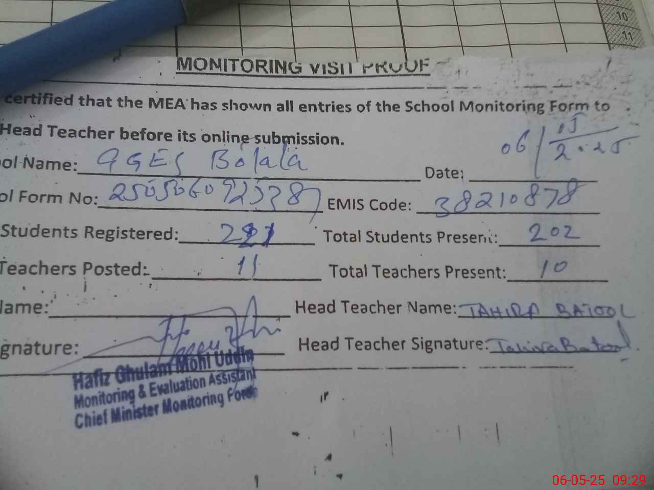 | Attendance Register | Head Teacher | MEA with School | Visit Proof |