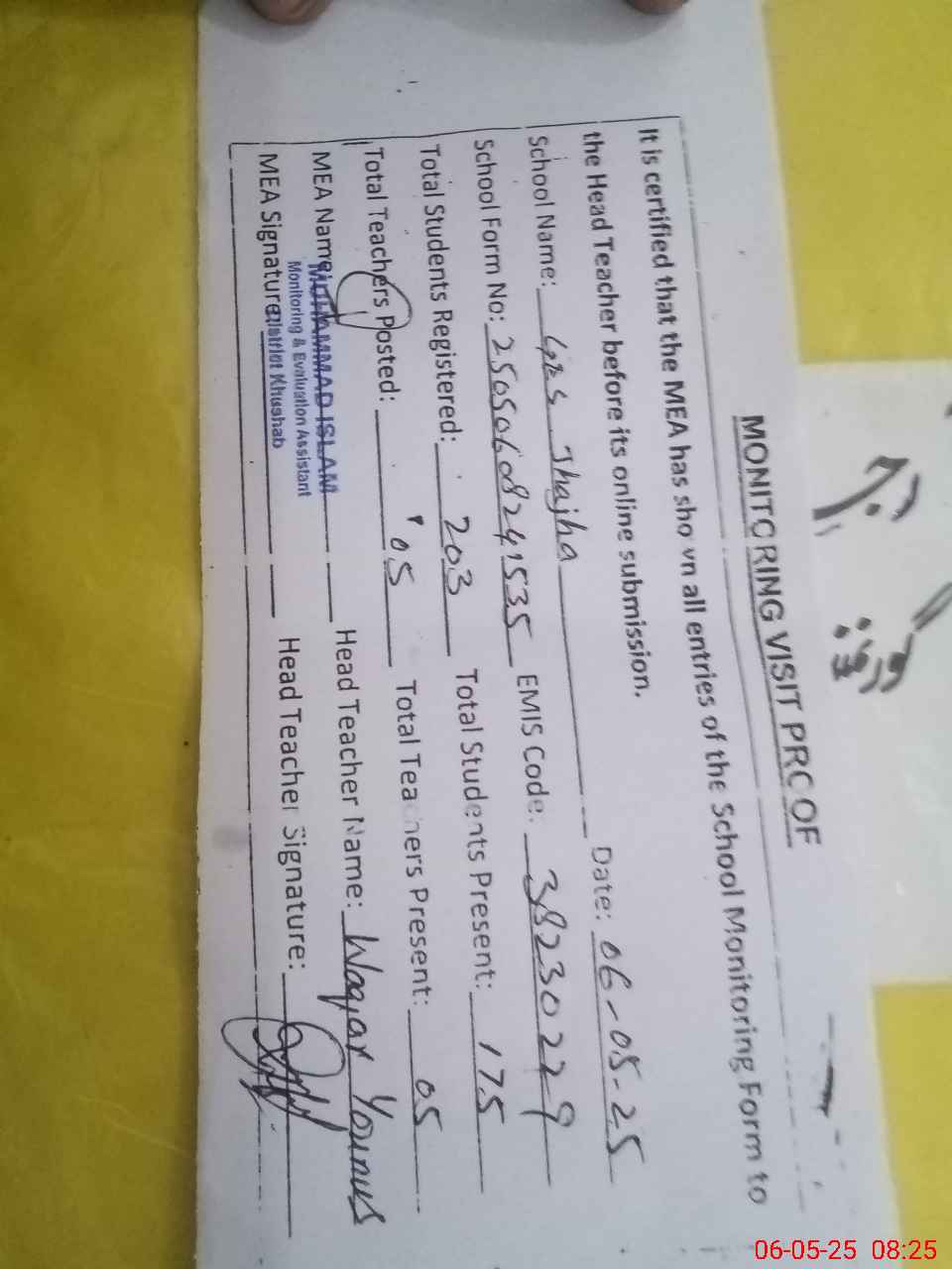 | Attendance Register | Head Teacher | MEA with School | Visit Proof |