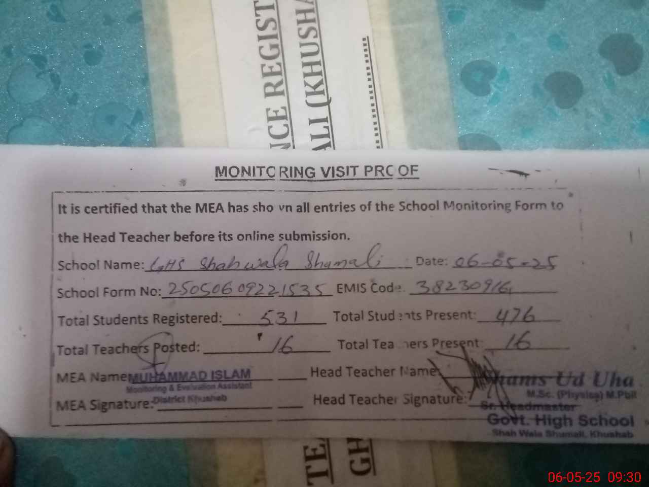 | EMIS Code: 38230916 | Name of School: GHS SHAH WALA SHUMALI | |||