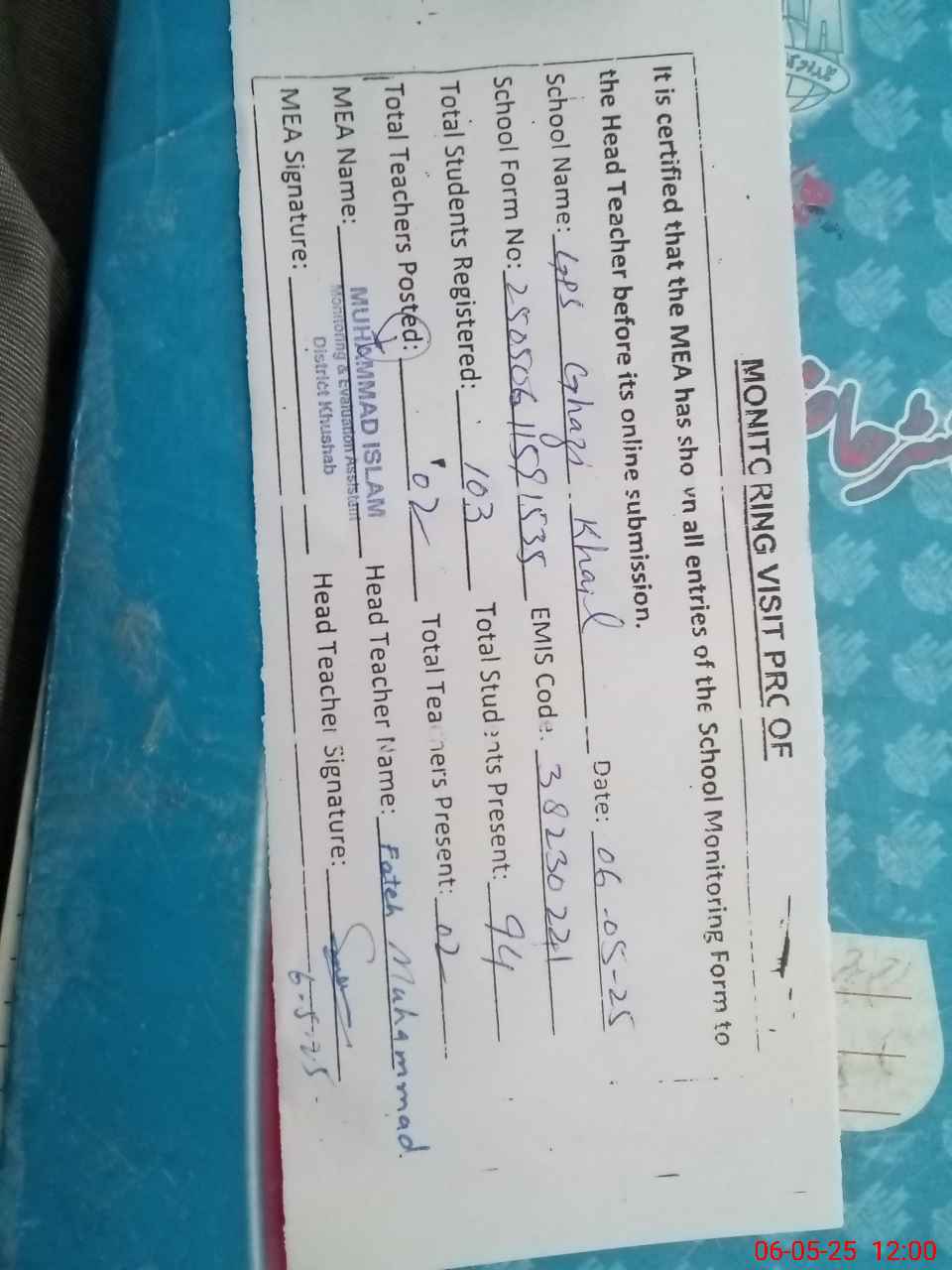 | EMIS Code: 38230221 | Name of School: GPS GHAZI KHAIL | |||