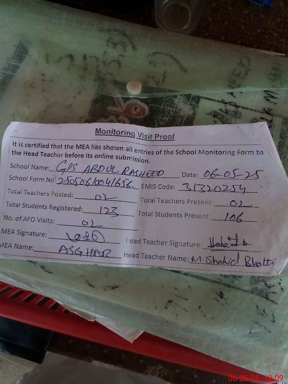 | Attendance Register | Head Teacher | MEA with School | Visit Proof |