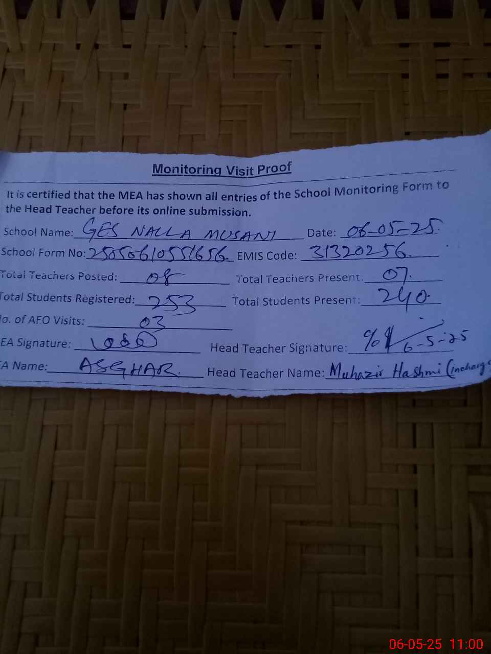 | Attendance Register | Head Teacher | MEA with School | Visit Proof |