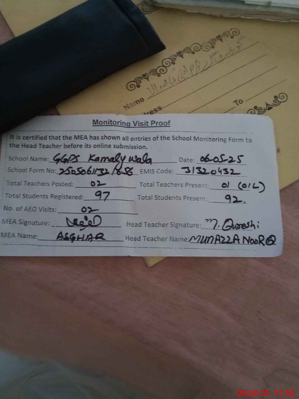 | Attendance Register | Head Teacher | MEA with School | Visit Proof |