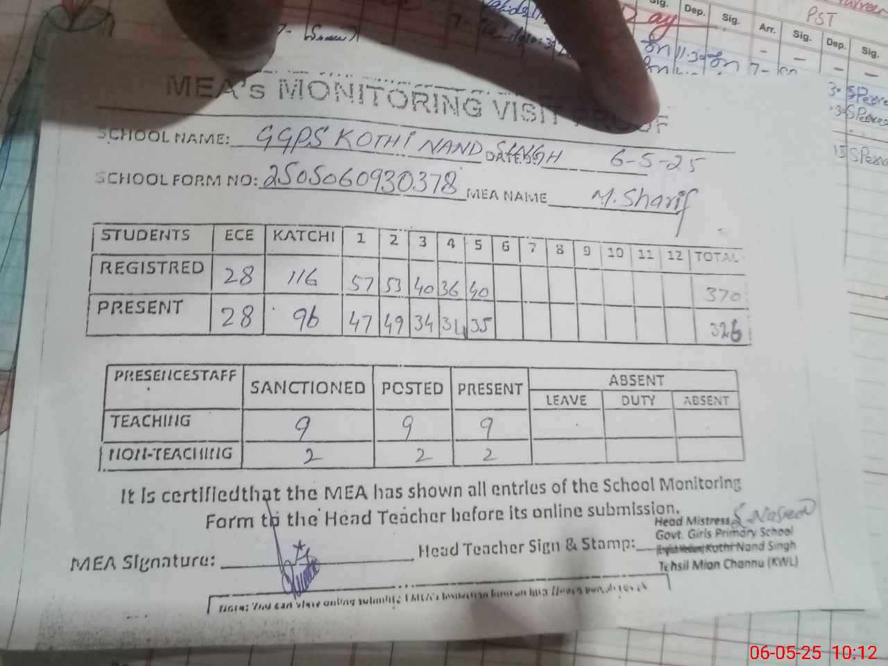 | EMIS Code: 36430269 | Name of School: GGPS KOTHI NAND SINGH, MIAN CHANNU | |||