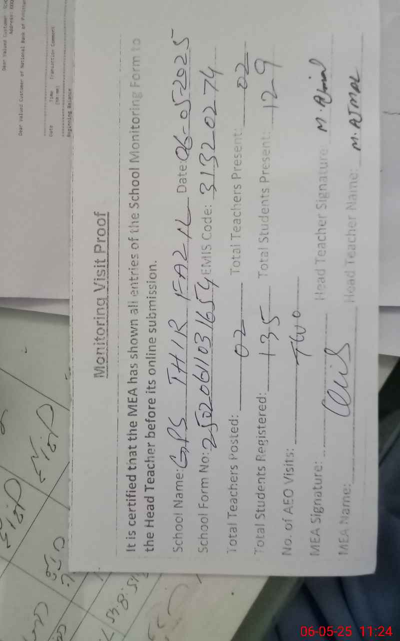| Attendance Register | Head Teacher | MEA with School | Visit Proof |