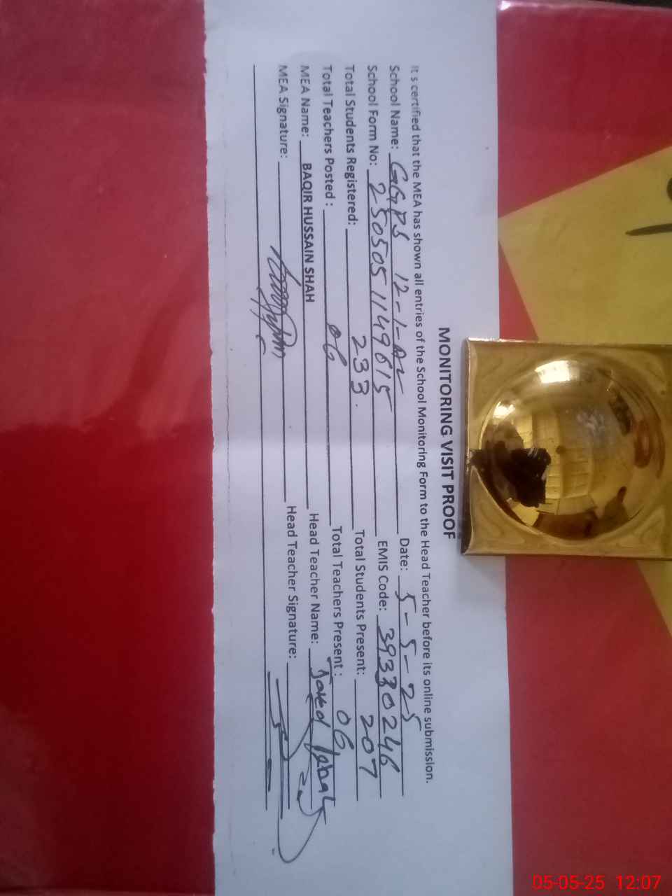| Attendance Register | Head Teacher | MEA with School | Visit Proof |