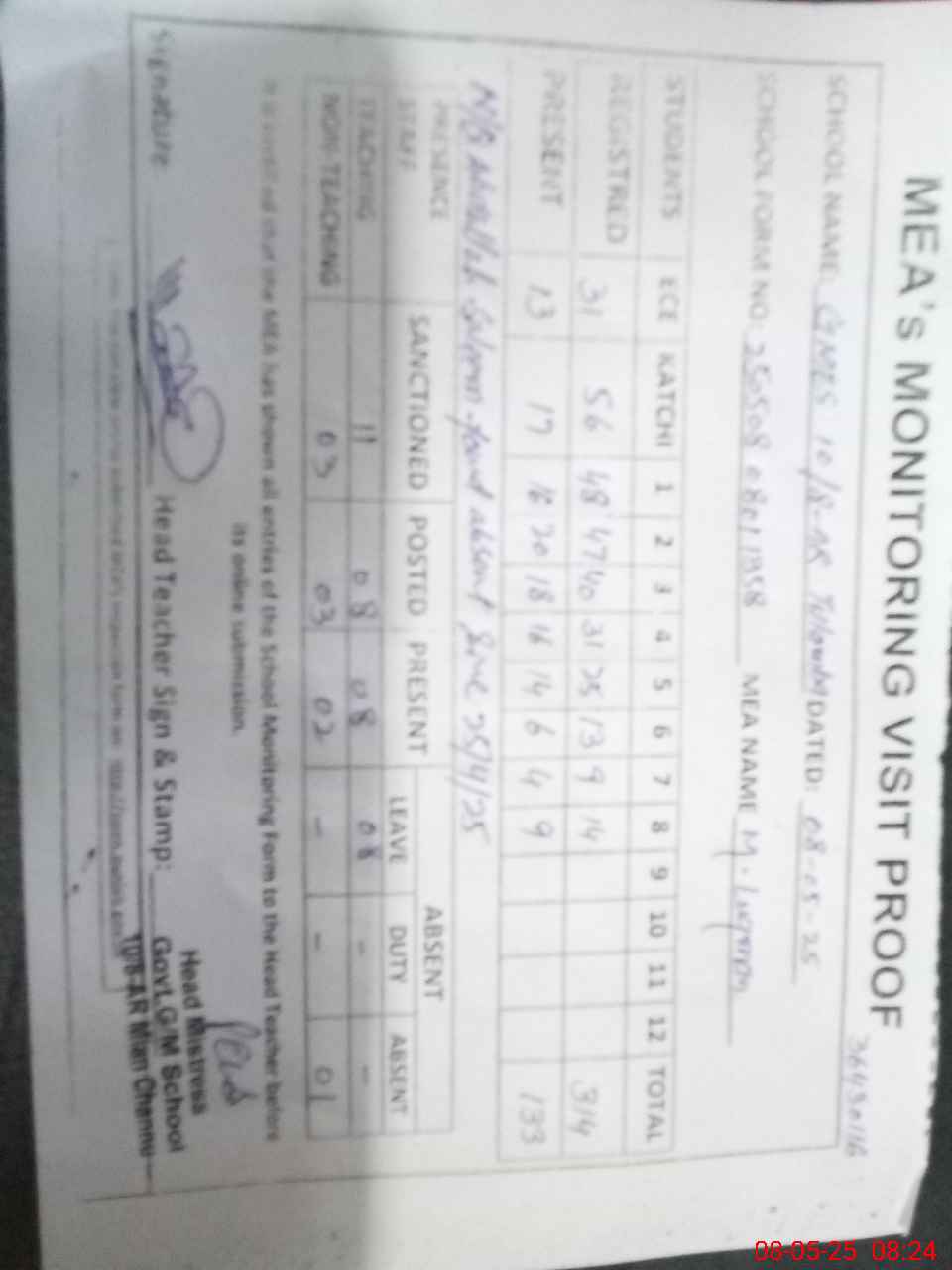 | Attendance Register | Head Teacher | MEA with School | Visit Proof |