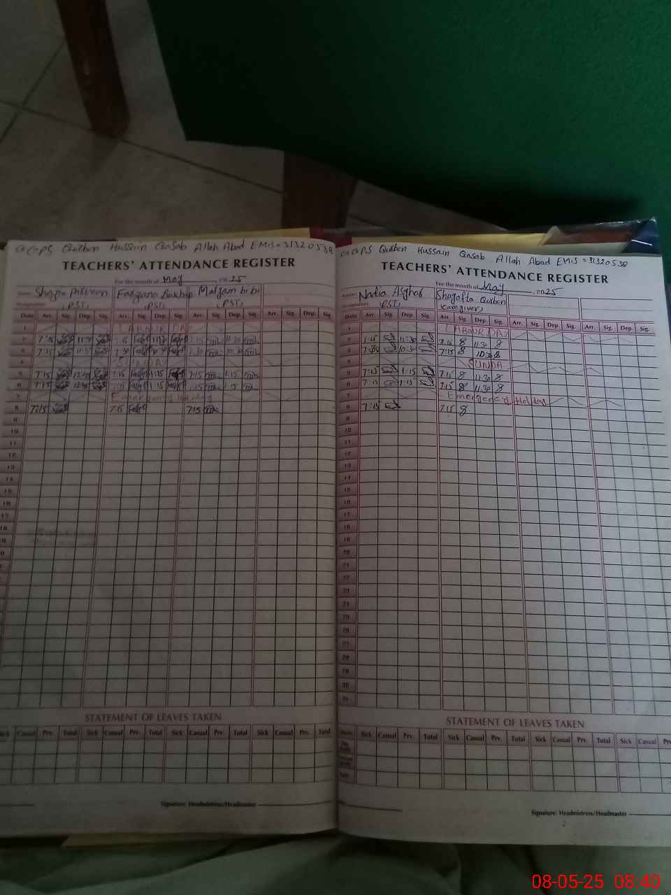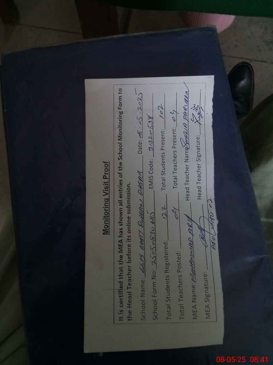 | Attendance Register | Head Teacher | MEA with School | Visit Proof |