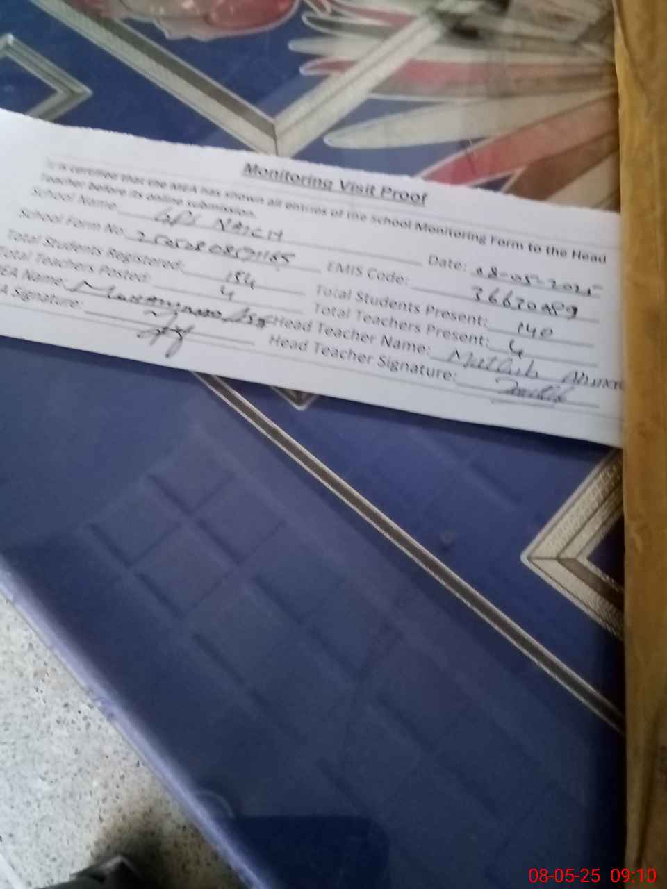 | Attendance Register | Head Teacher | MEA with School | Visit Proof |