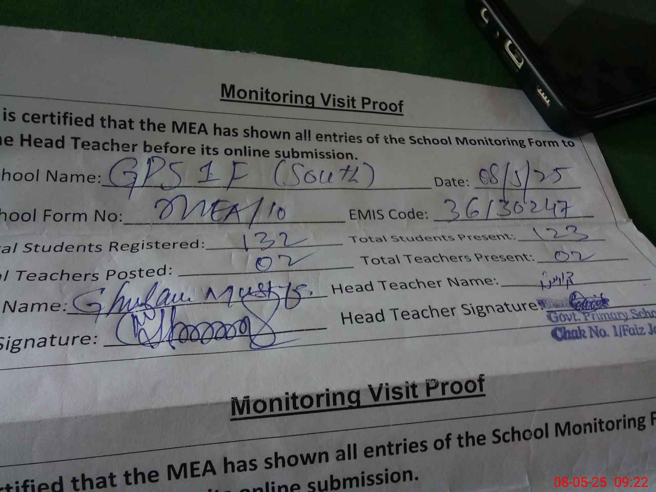 | Attendance Register | Head Teacher | MEA with School | Visit Proof |