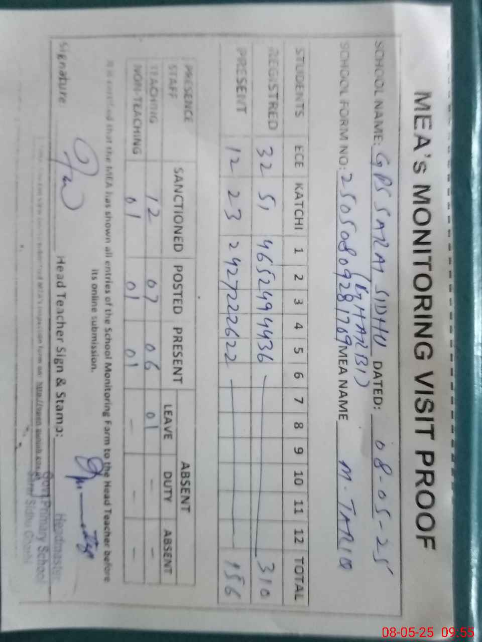 | Attendance Register | Head Teacher | MEA with School | Visit Proof |