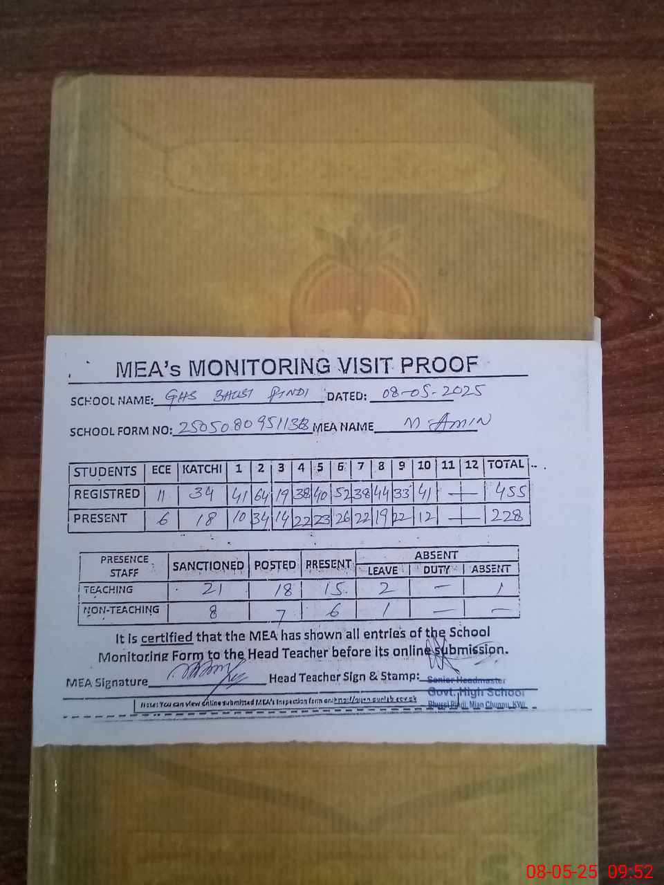| Certified that this School was Inspected by the Undersigned MEA/DMO Today and the Information Stated Above is as Per Record. | |||||