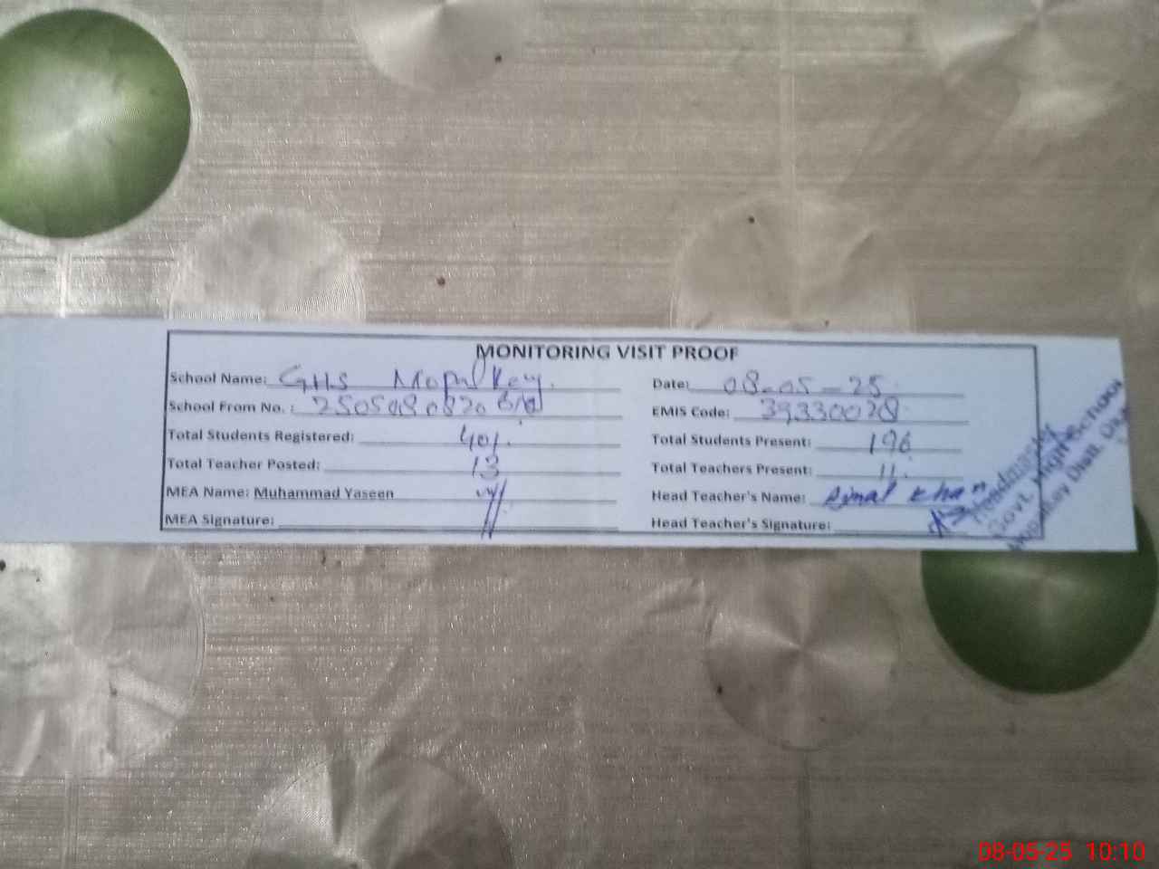 | Attendance Register | Head Teacher | MEA with School | Visit Proof |