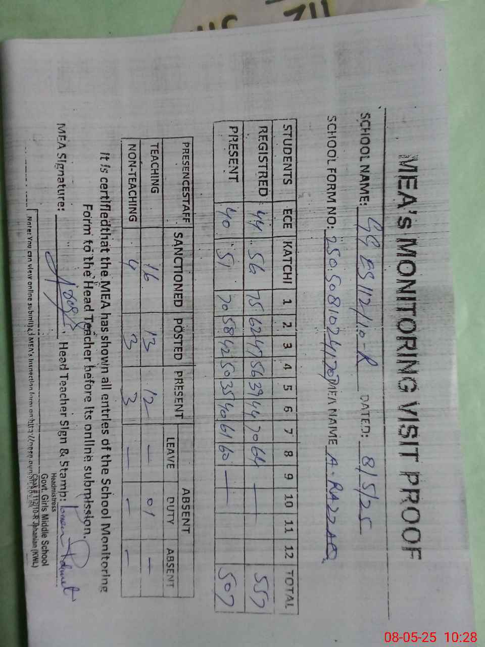 | Attendance Register | Head Teacher | MEA with School | Visit Proof |