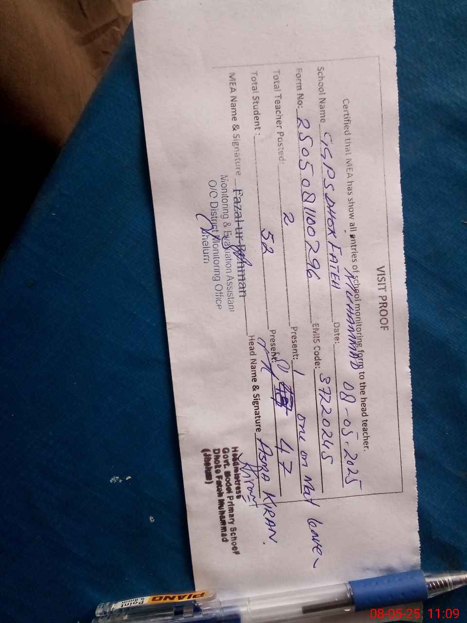 | Attendance Register | Head Teacher | MEA with School | Visit Proof |