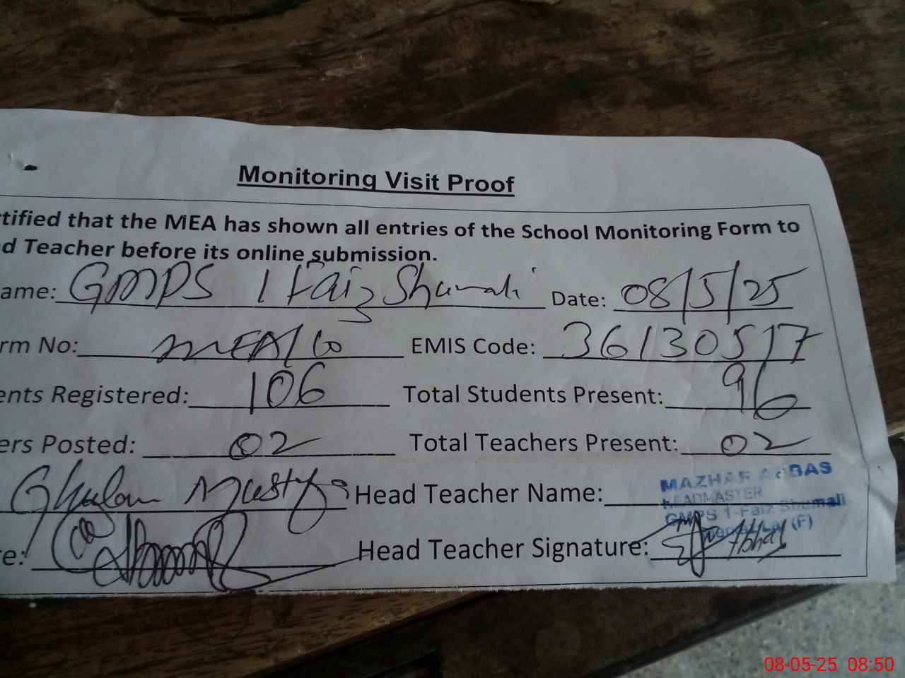 | Attendance Register | Head Teacher | MEA with School | Visit Proof |