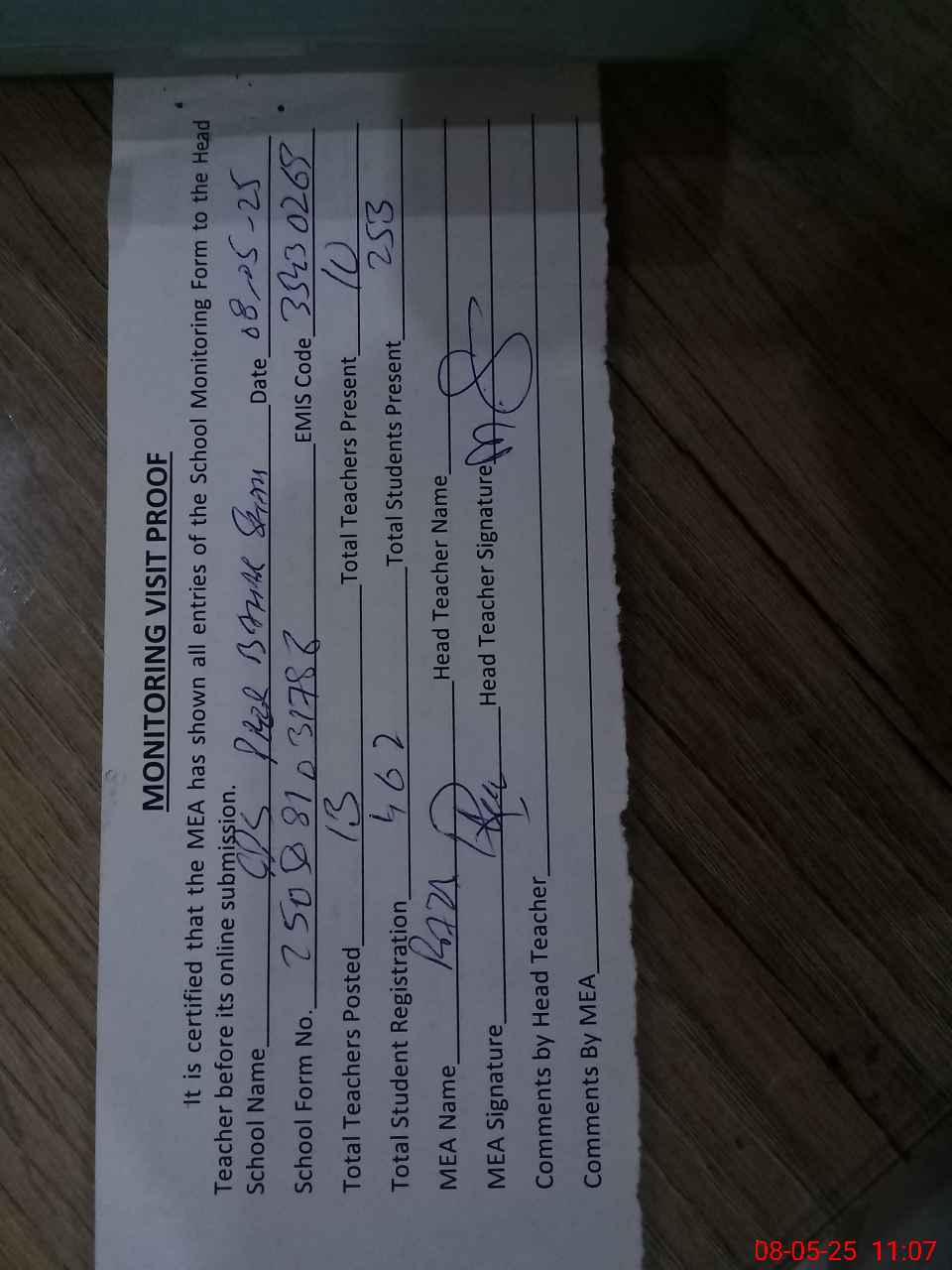 | Attendance Register | Head Teacher | MEA with School | Visit Proof |