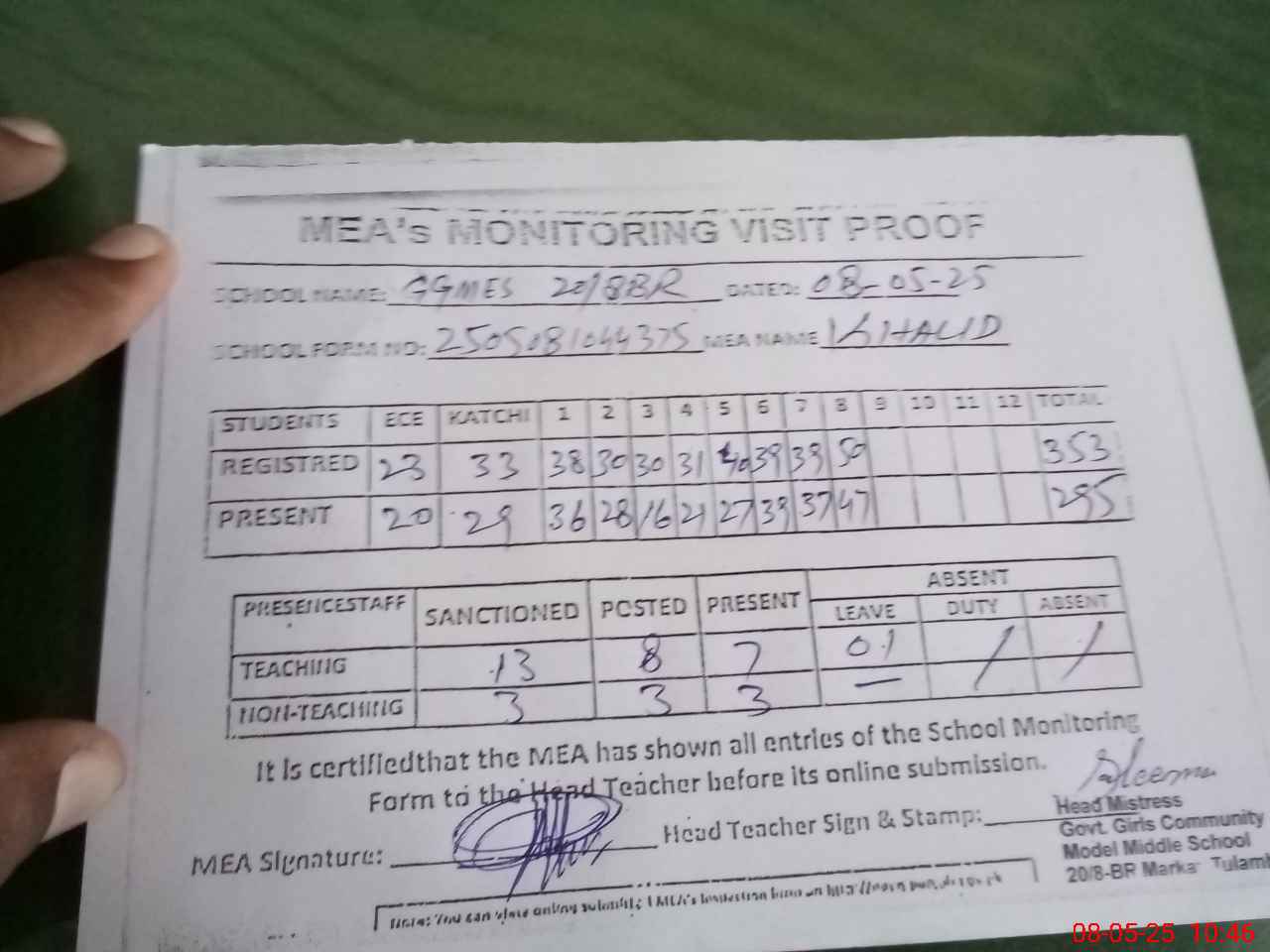 | Attendance Register | Head Teacher | MEA with School | Visit Proof |