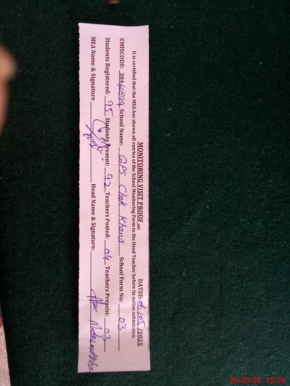 | Attendance Register | Head Teacher | MEA with School | Visit Proof |