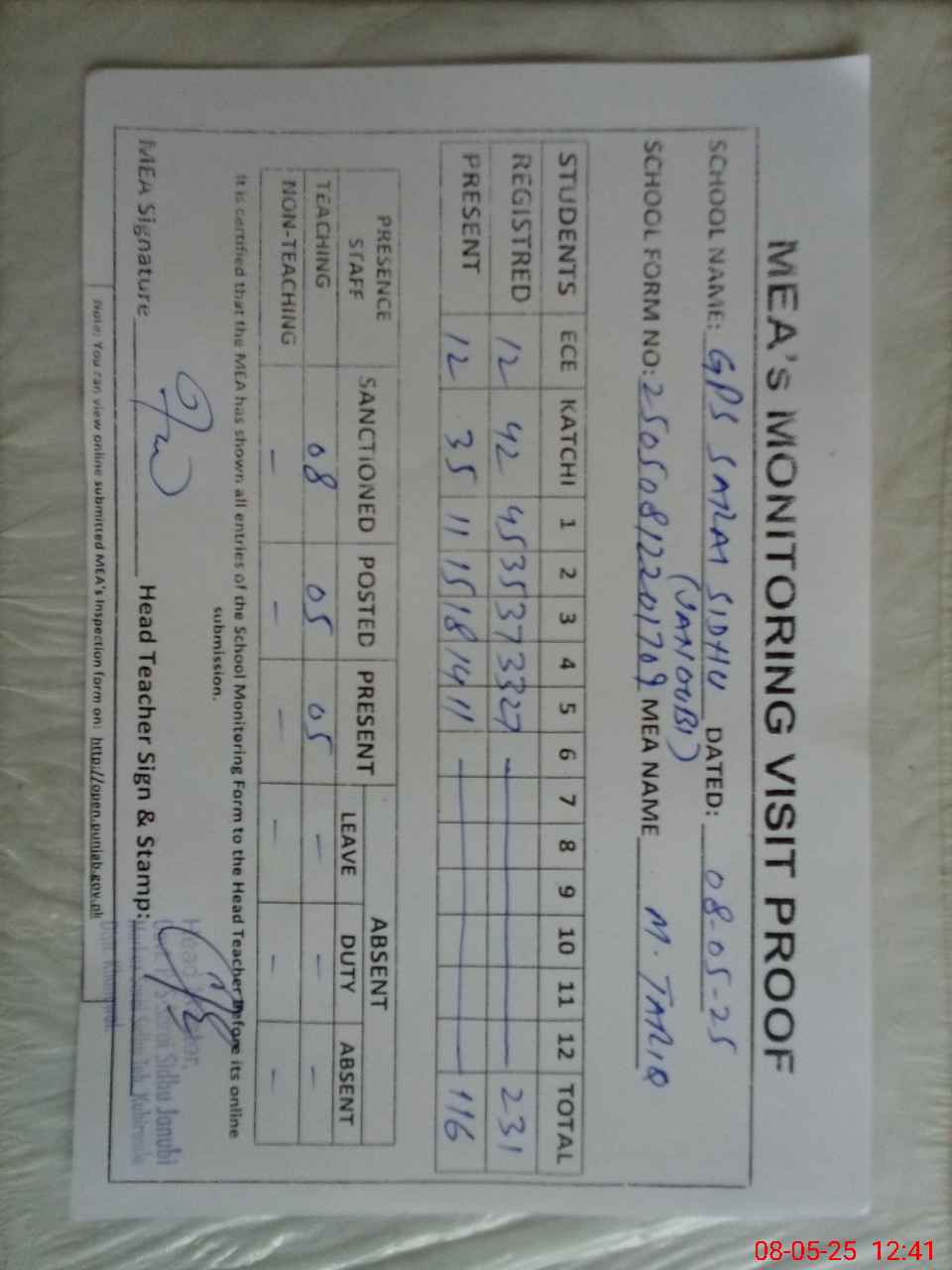 | Attendance Register | Head Teacher | MEA with School | Visit Proof |