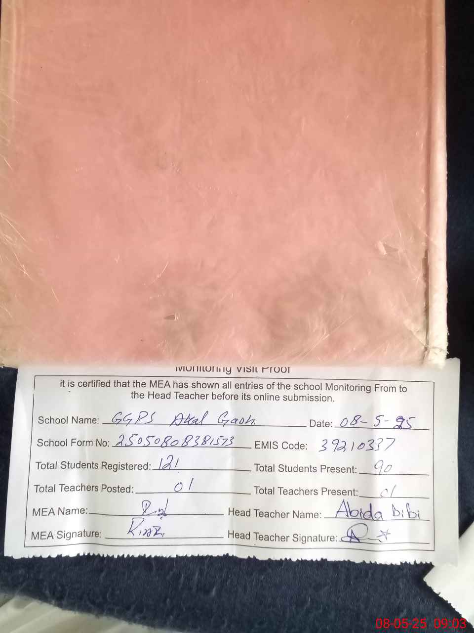 | Attendance Register | Head Teacher | MEA with School | Visit Proof |