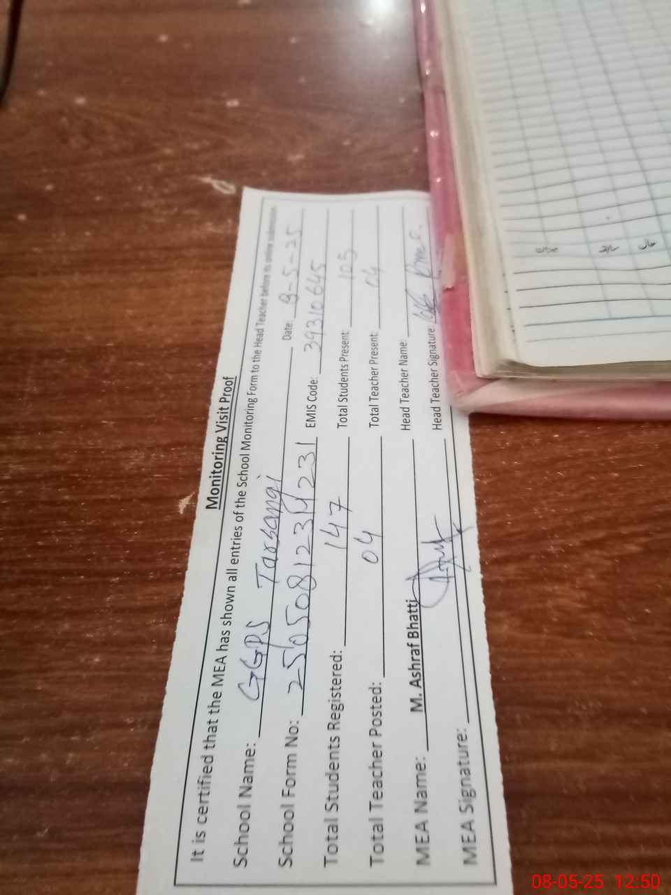 | Attendance Register | Head Teacher | MEA with School | Visit Proof |