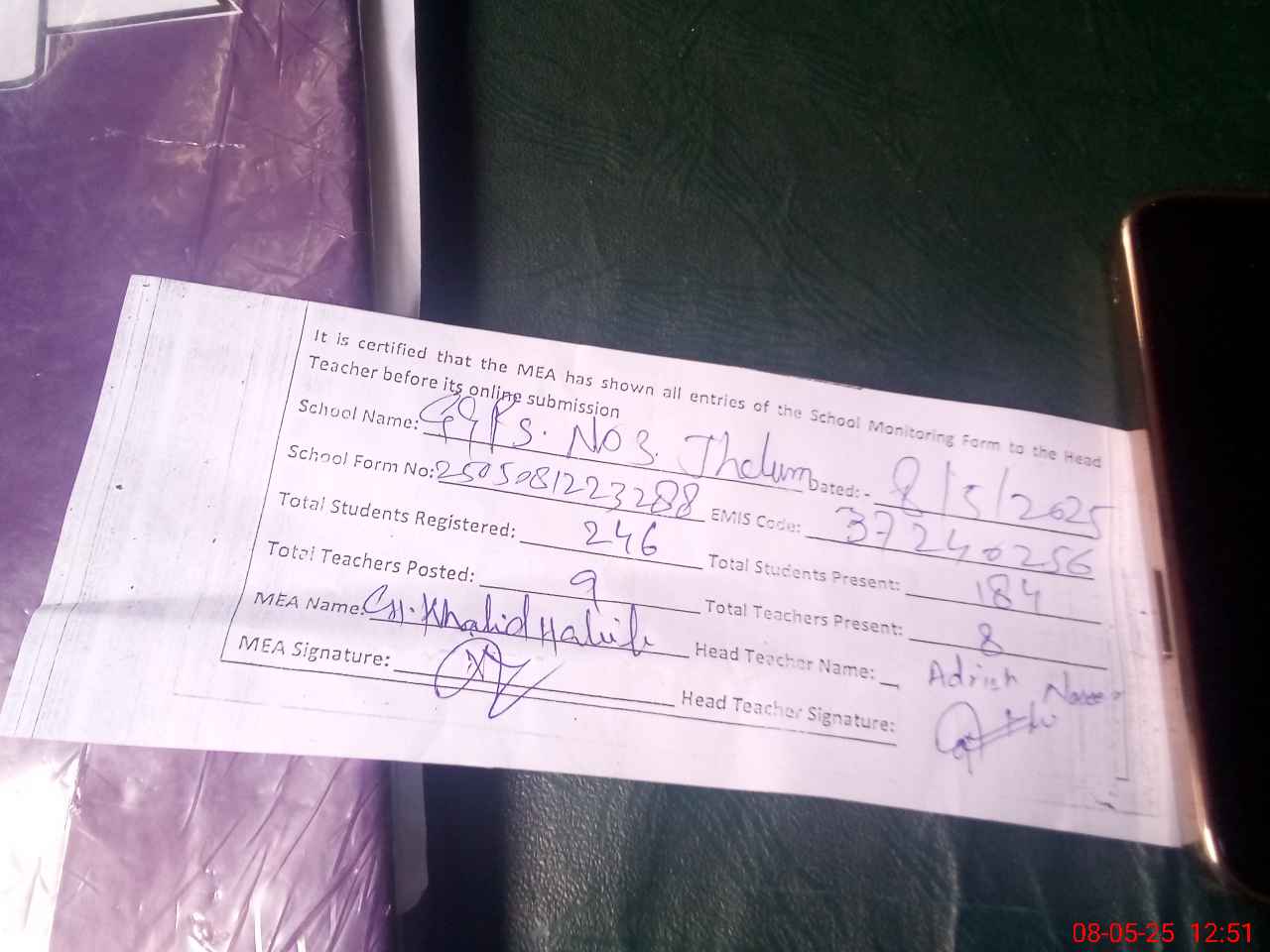 | Attendance Register | Head Teacher | MEA with School | Visit Proof |