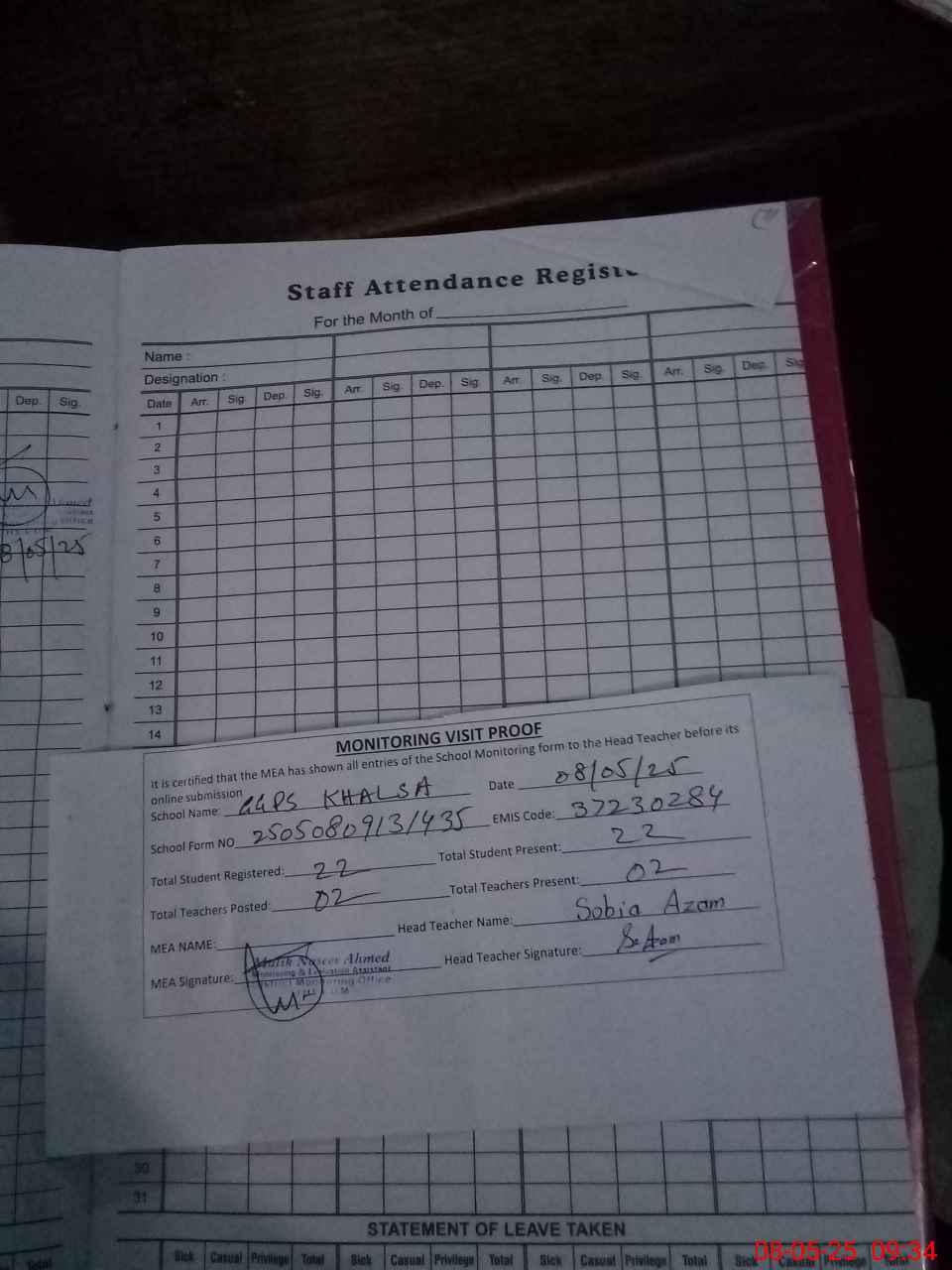 | Attendance Register | Head Teacher | MEA with School | Visit Proof |