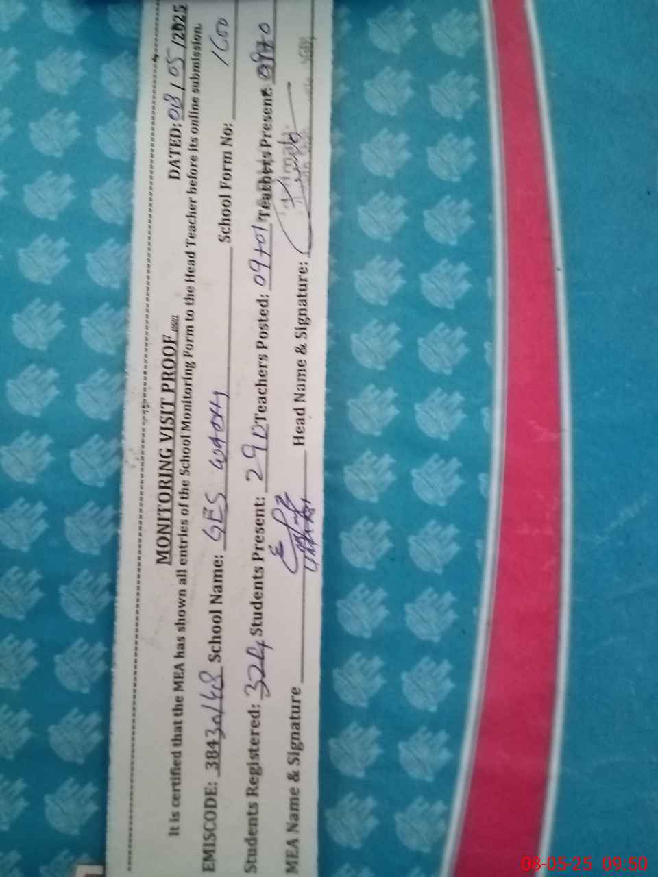 | Attendance Register | Head Teacher | MEA with School | Visit Proof |