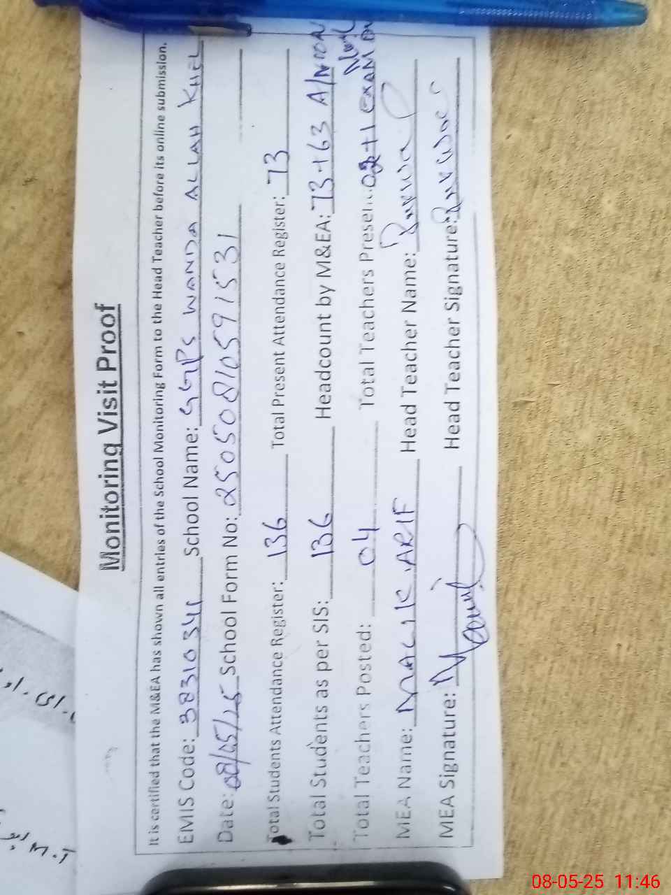 | Attendance Register | Head Teacher | MEA with School | Visit Proof |