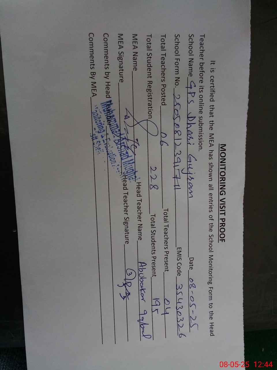 | Attendance Register | Head Teacher | MEA with School | Visit Proof |