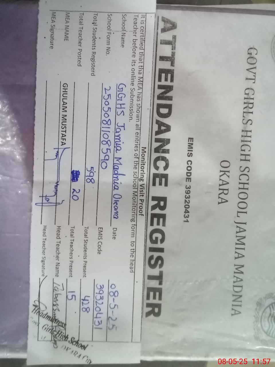 | Attendance Register | Head Teacher | MEA with School | Visit Proof |