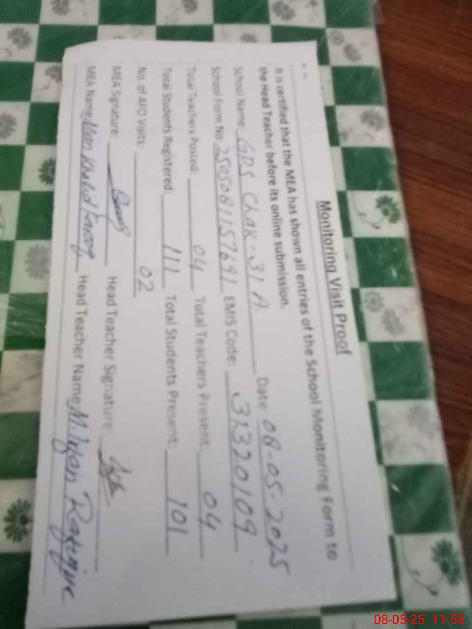 | Attendance Register | Head Teacher | MEA with School | Visit Proof |