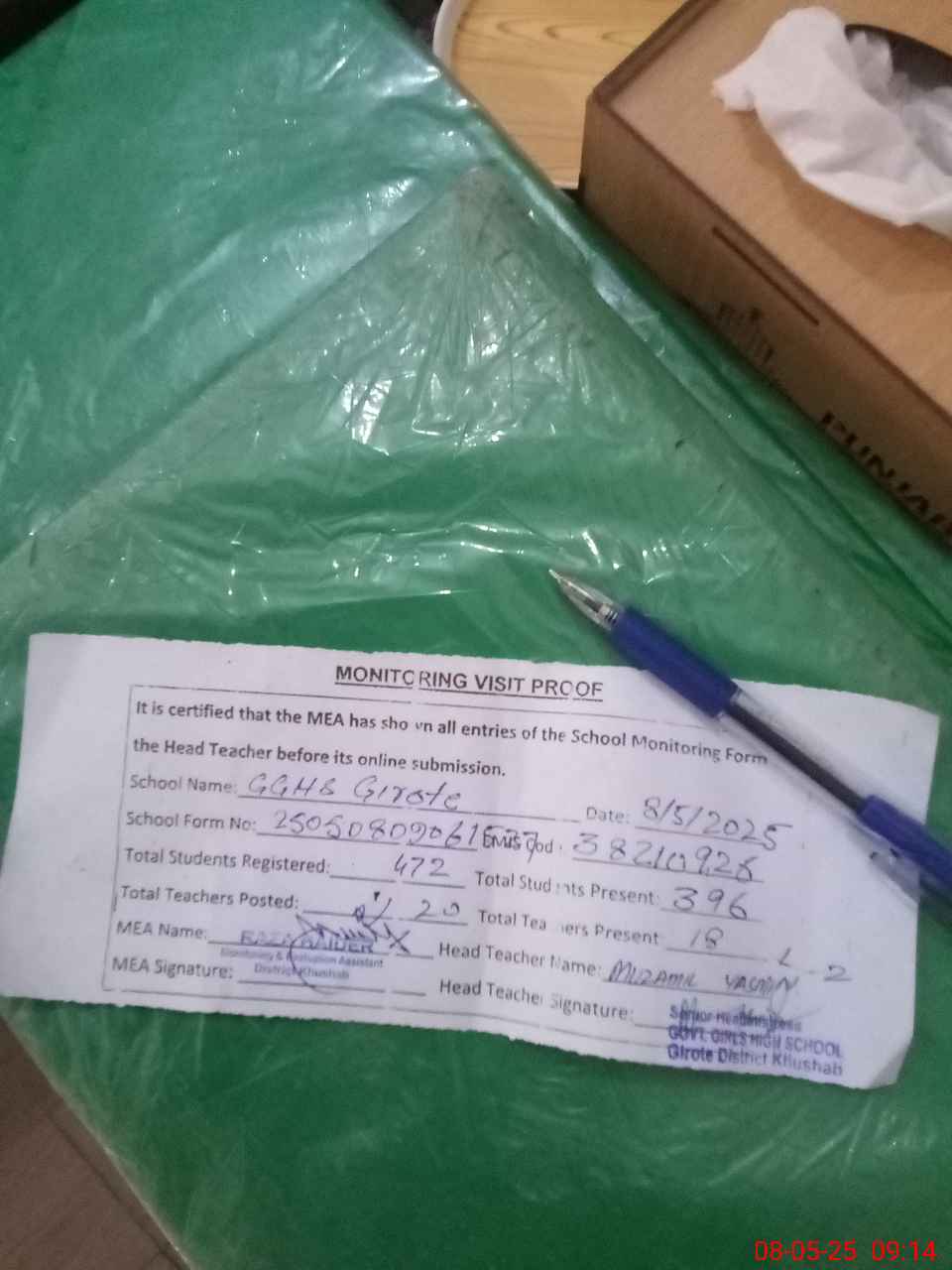 | Attendance Register | Head Teacher | MEA with School | Visit Proof |