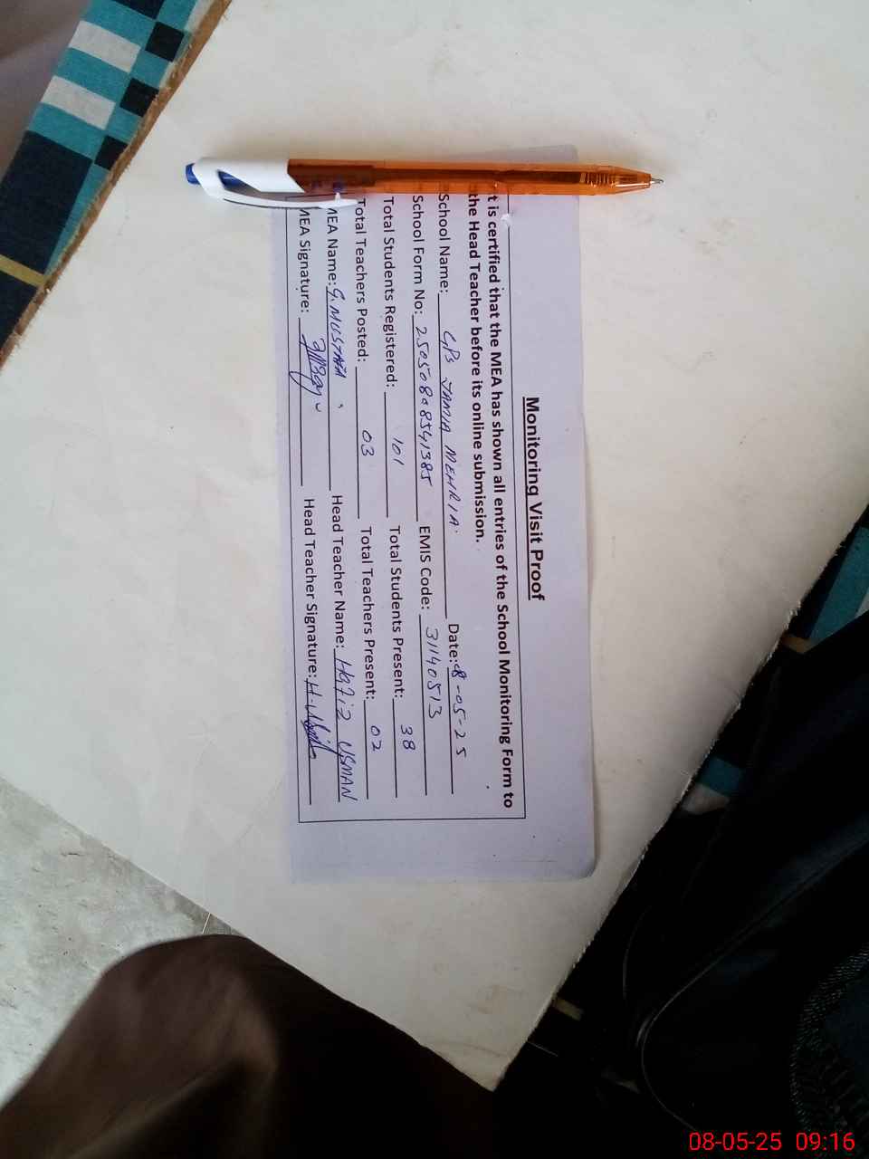 | Attendance Register | Head Teacher | MEA with School | Visit Proof |