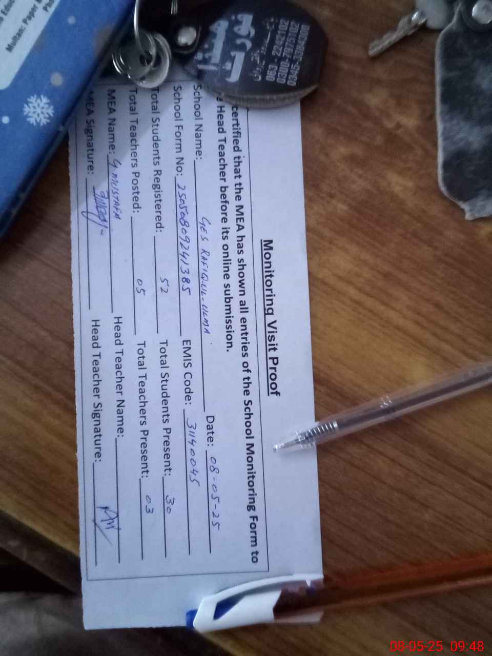 | Attendance Register | Head Teacher | MEA with School | Visit Proof |