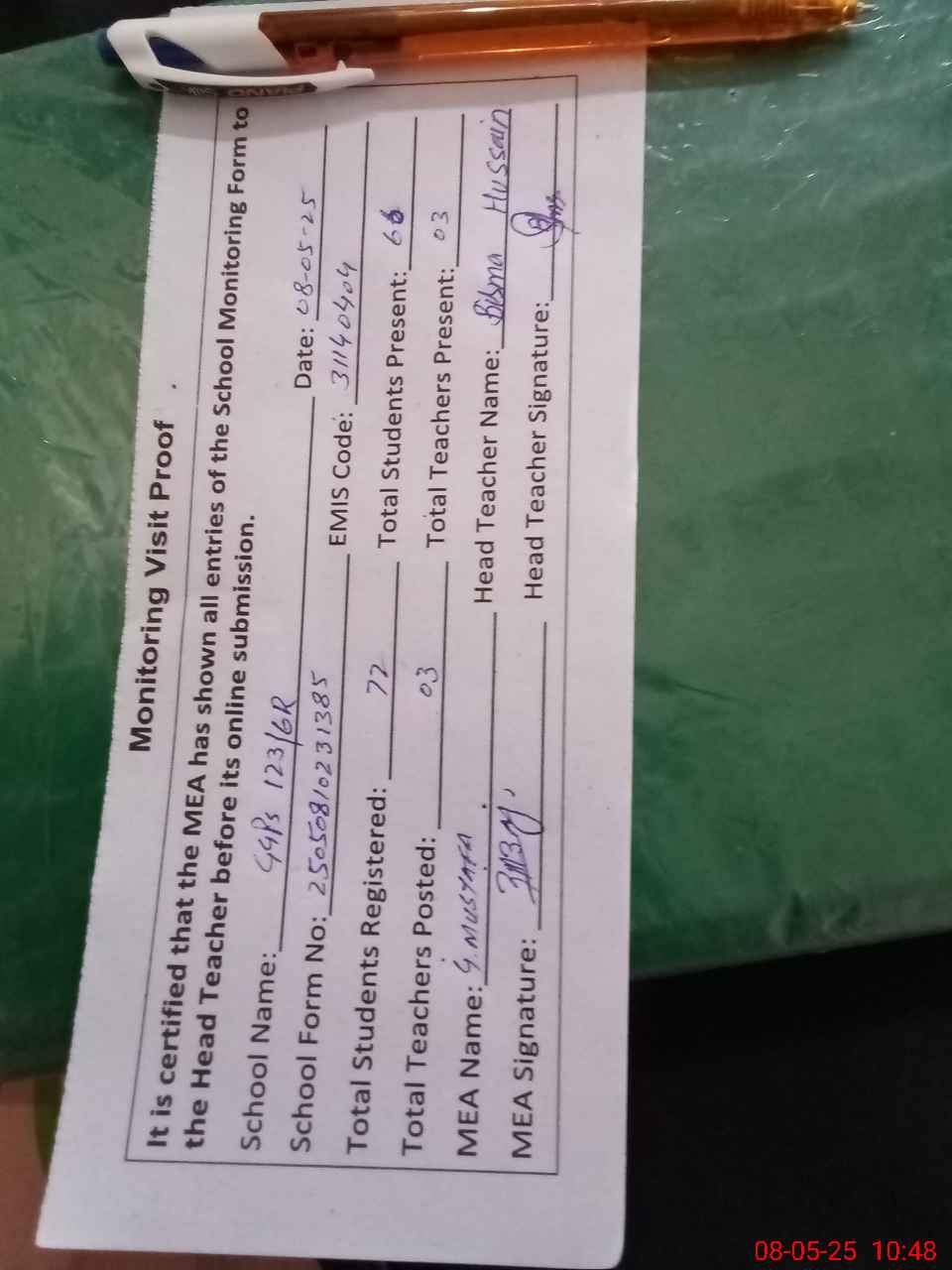 | Attendance Register | Head Teacher | MEA with School | Visit Proof |